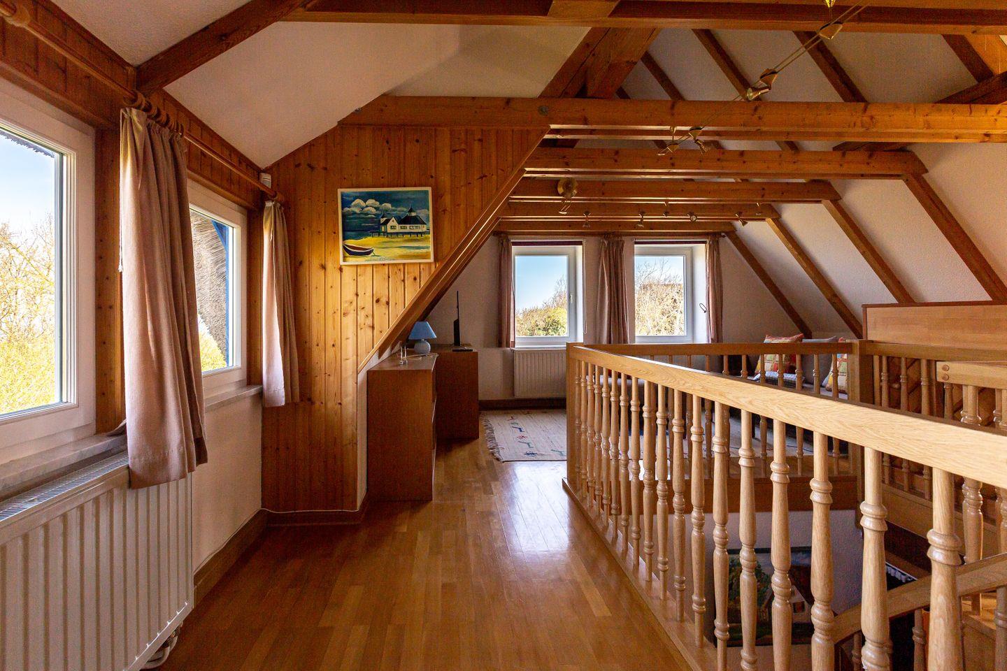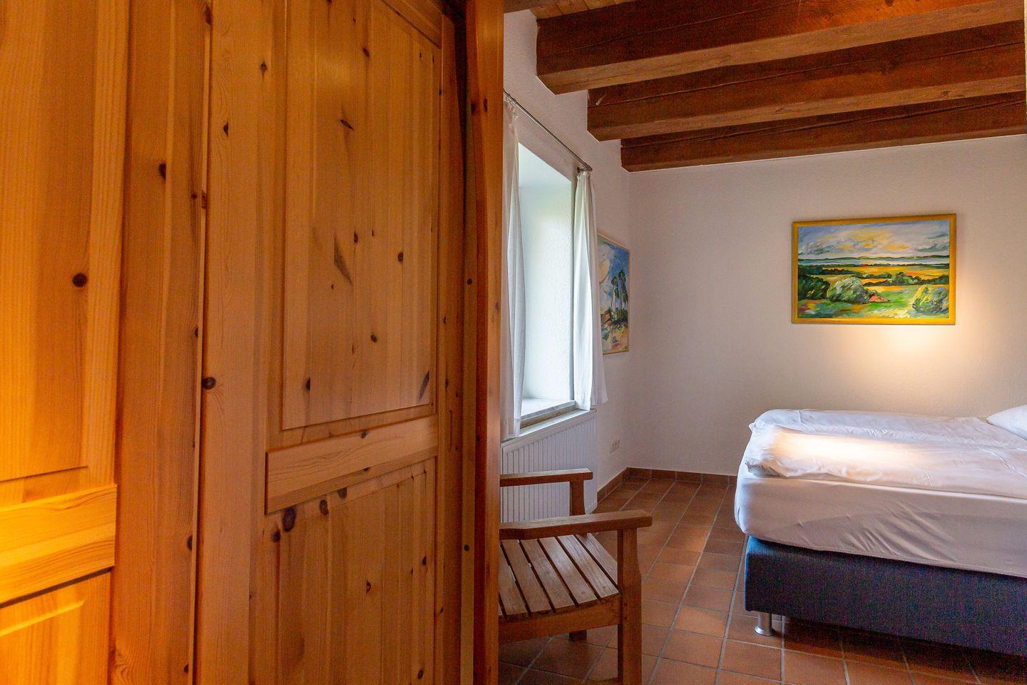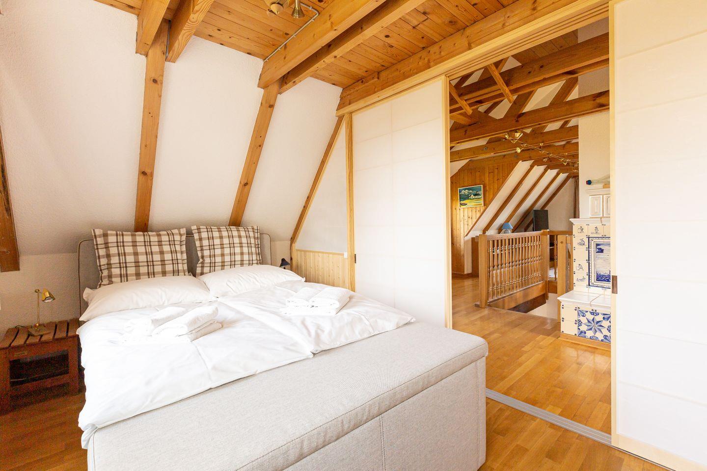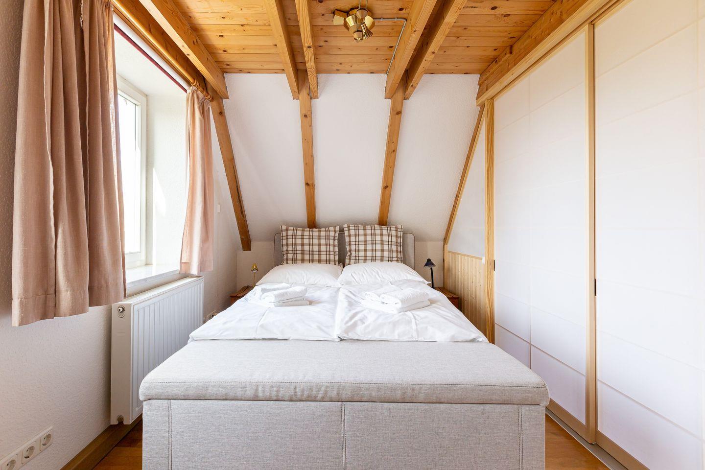Durch die Darßer Tür und den kleinen Flur betritts du den großzügigen Küchenbereich. Es sind Besonderheiten wie die massiven Deckenbalken, der dekorative gekachelte Kamin und die sonnige Essecke, die den Raum so gemütlich machen. Dank der gut ausgestatteten Küche lässt es sich hier nach Herzenslust Kochen und Klönen. Von der Küche betritt man das Hauptschlafzimmer mit Doppelbett und großem Kleiderschrank. Der Blick aus dem Fenster zeigt die wundervolle Natur, hinter der sich die Ostsee versteckt. Hier kannst du garantiert gut schlafen, nicht zuletzt, weil das Rauschen des Meeres für die richtige Entspannung und innere Ruhe sorgt. Abgerundet wird das Erdgeschoss durch das Badezimmer, dass mit einer Dusche ausgestattet ist. Über eine Holztreppe gelangst du in den Wohnbereich des Hauses, der mit seinen Fachwerkbalken und dem maritimen Interieur viel Wärme und Gemütlichkeit ausstrahlt. Vom Sofa aus genießt du einen traumhaften Blick aufs Meer und die Reetdächer der alten Fischlandkaten. Ein Klavier zum Spielen steht ebenfalls bereit und bietet die passende Untermalung für spektakuläre Sonnenuntergänge, die du vom Wohnzimmer aus genießen kannst. Vom Wohnbereich durch eine japanische Shoji-Tür getrennt, befindet sich das zweite Schlafzimmer, ebenfalls mit einem Doppelbett und herrlichem Blick auf die weiten Wiesen.