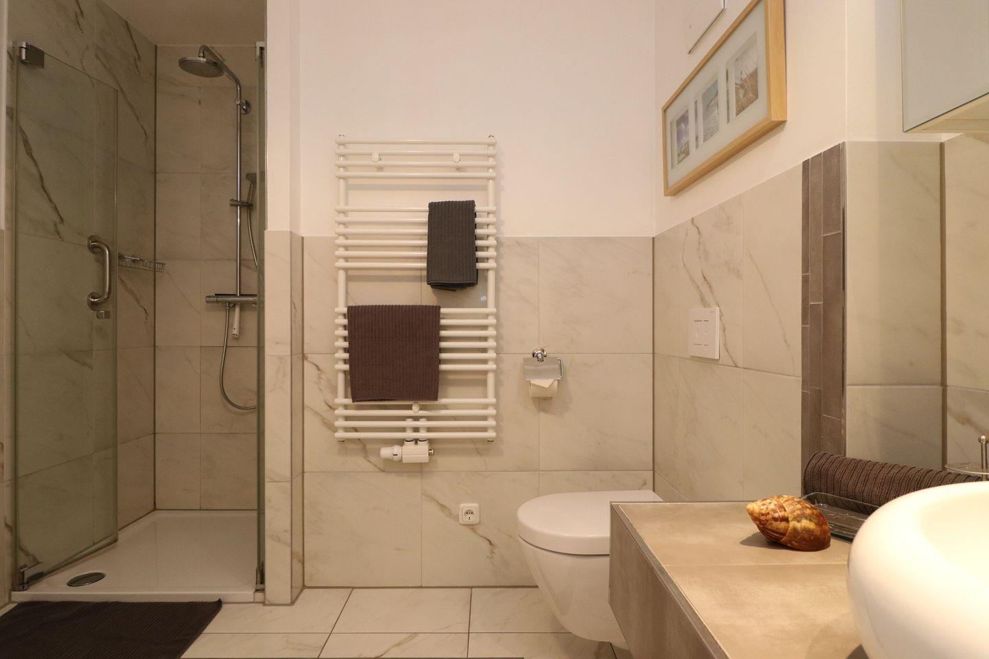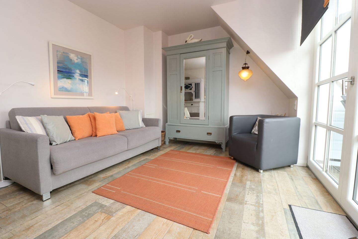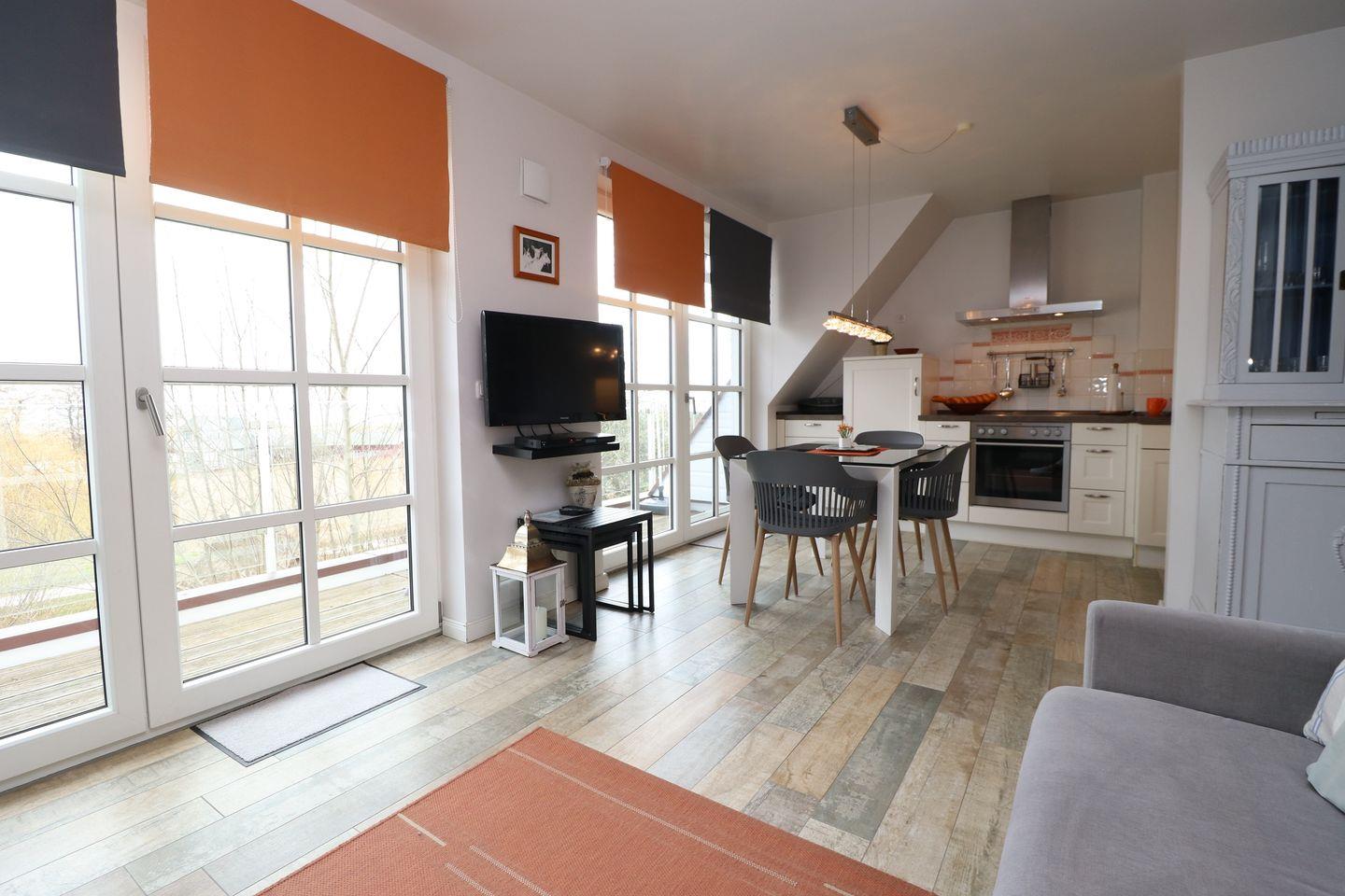 Ein gemütliches Maisonette-Appartement im Obergeschoss, perfekt für maximal 4 Personen. Genießen Sie ein Ost-Balkon mit Blick auf den Bodden, ideal für entspannte Stunden im Freien und wunderschöne Sonnenuntergänge. Im Obergeschoss befindet sich das Wohnzimmer mit Schlafcouch und einer praktischen Küchenzeile, damit Sie sich selbst versorgen können, sowie ein Bad mit einer Dusche und WC. Das Schlafzimmer befindet sich im Dachgeschoss und verfügt über ein komfortables Doppelbett für erholsamen Schlaf. Haustiere und das Rauchen sind in der Wohnung nicht gestattet, jedoch gibt es WLAN für einen bequemen Internetzugang während des Aufenthalts. Eine Waschmaschine und Trockner stehen gegen Gebühr im Gemeinschaftsraum in der Tiefgarage zur Verfügung. Ein Tiefgaragenstellplatz ist ebenfalls vorhanden.