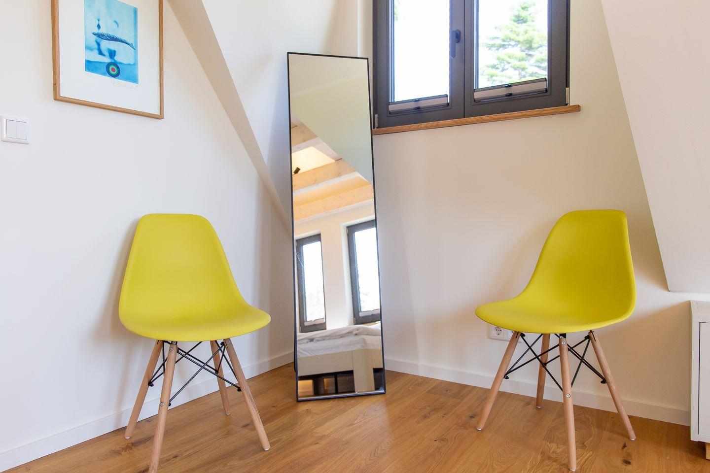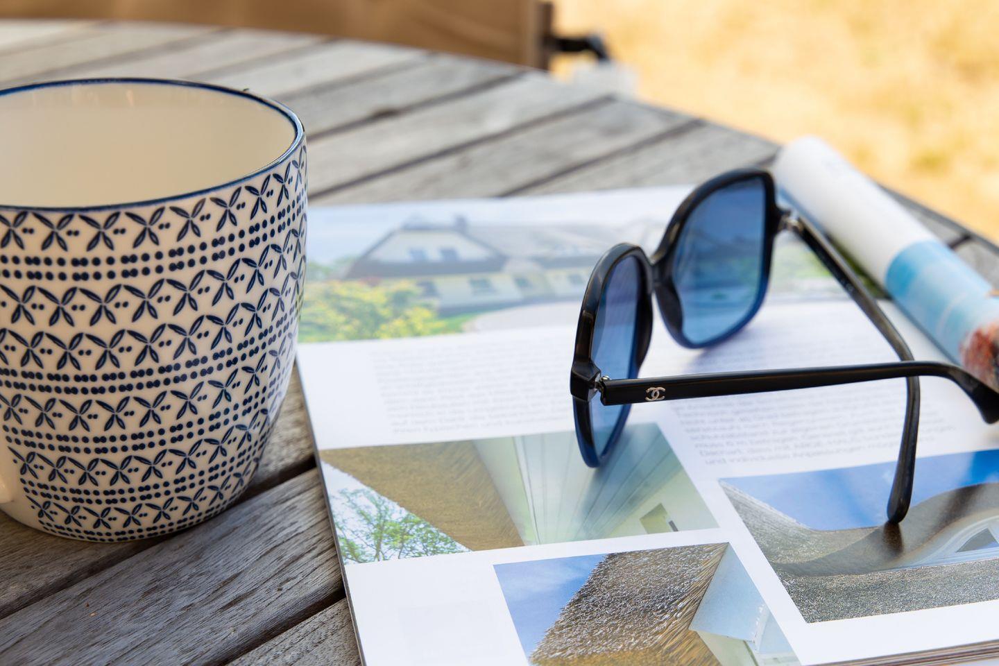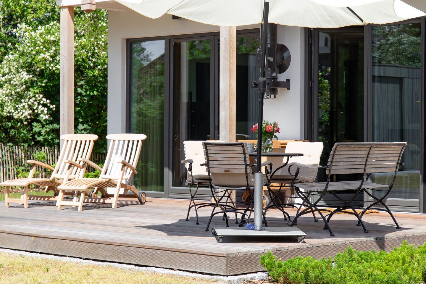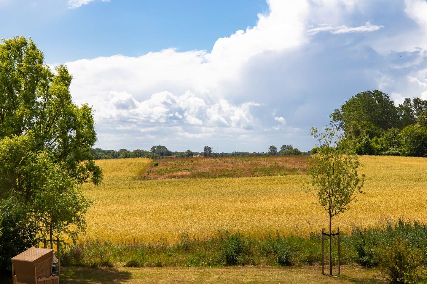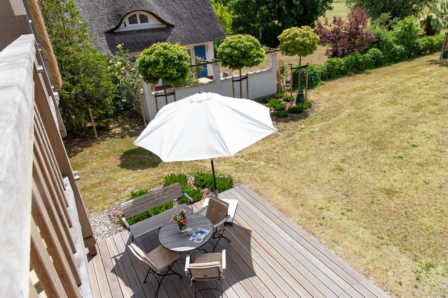 Auf dem 1100 qm großen Außenbereich begeistert die groß angelegte Holzterrasse mit Gartenbestuhlung, Strandkorb und Sonnenschirm. Mit Blick in die Weite und der traumhaften Ruhe genießt man im Garten ebenso schöne Erholungsmomente, als würde man am Meer sitzen. Hier bekommt man Ostseeurlaub auf höchstem Niveau.