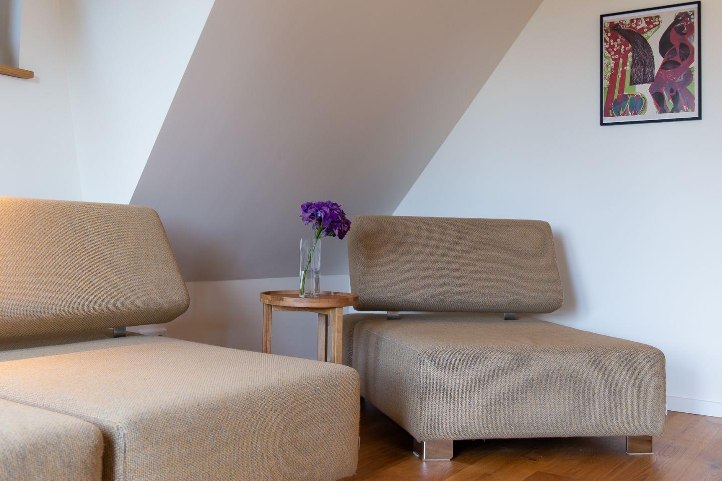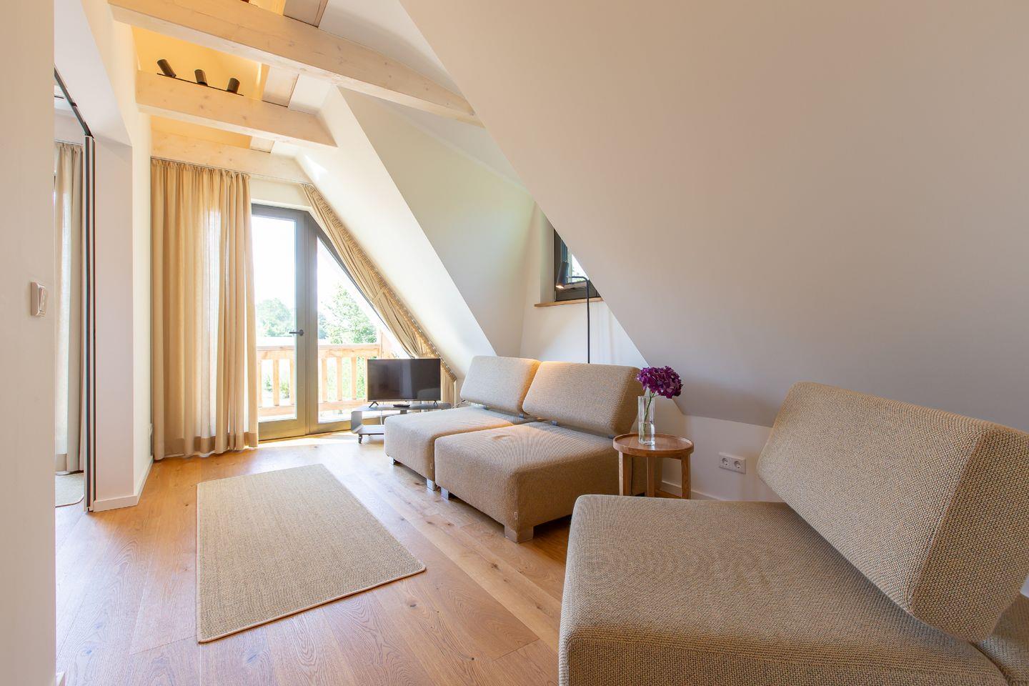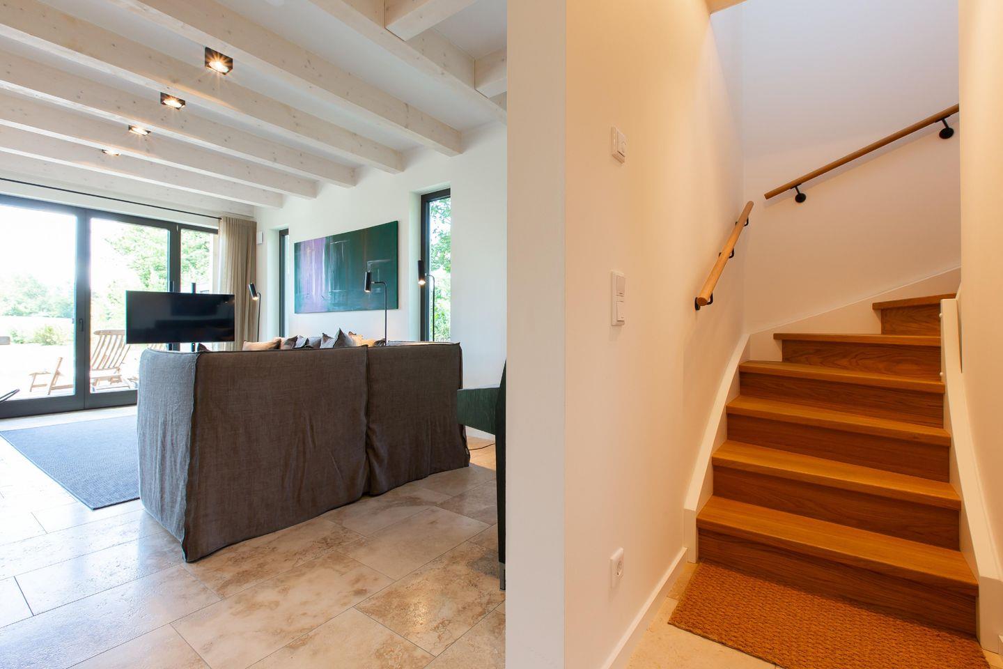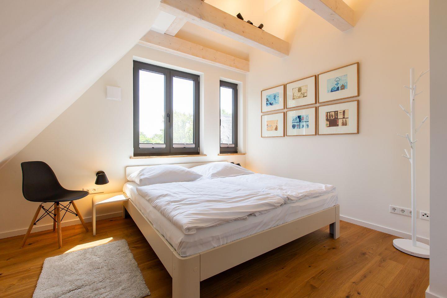 Über die Treppe gelangt man in die zweite Wohnebene des Hauses. Hier befindet sich ebenfalls ein Wohnraum mit Sofalandschaft und TV. Zwei weitere Schlafzimmer – eins mit Bad en Suite - sorgen für ausreichend Privatsphäre und wundervoll eingerichtete Rückzugsorte. Ein besonderes Highlight ist die Sauna, in der man nach einem langen Winterspaziergang entspannen und die Seele baumeln lassen kann. Abgerundet wird der Wohnkomfort mit einem dritten Badezimmer und einem Balkon, der einen herrlichen Blick über die Reetdächer der Nachbarhäuser und Felder bietet.