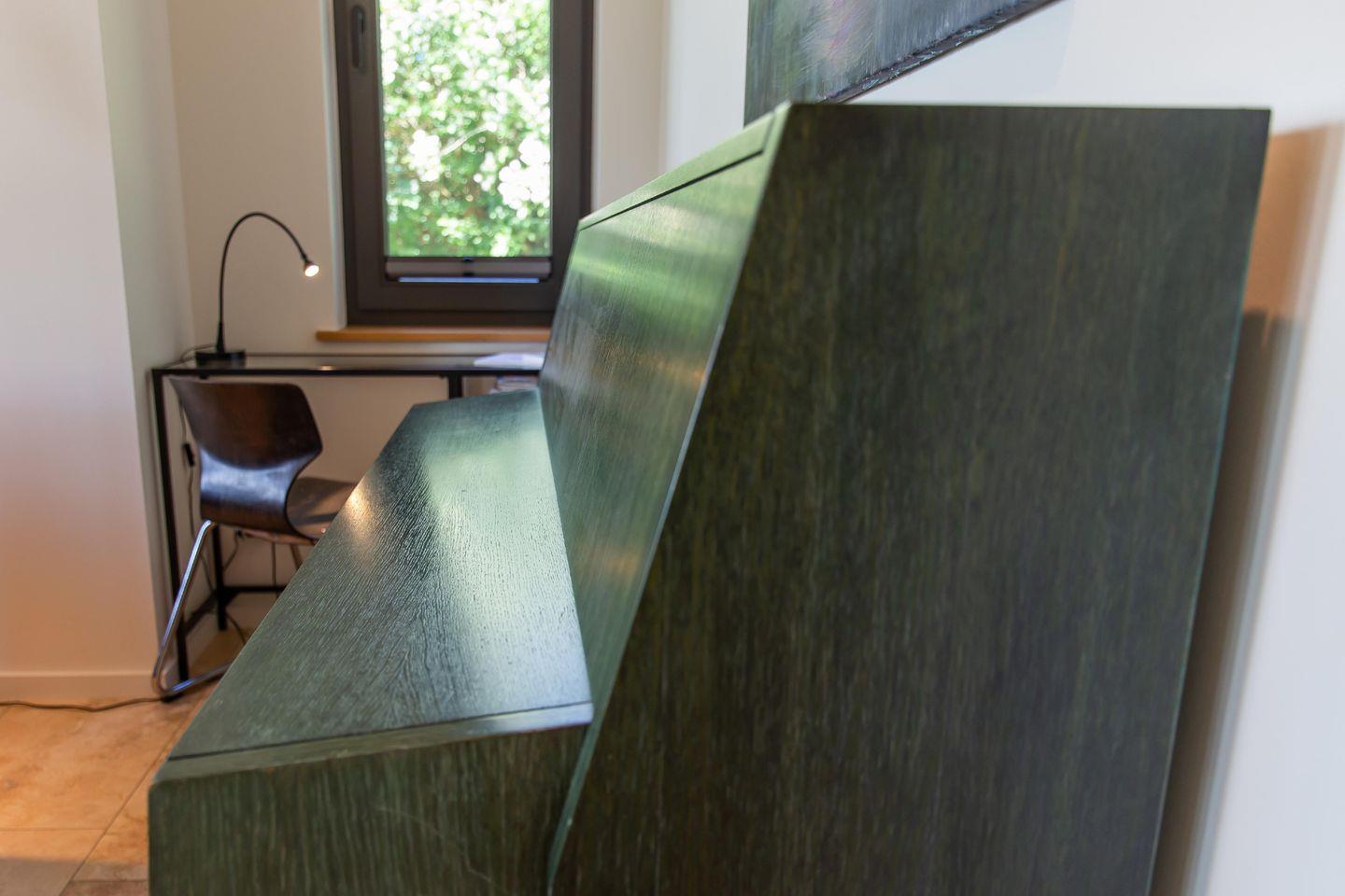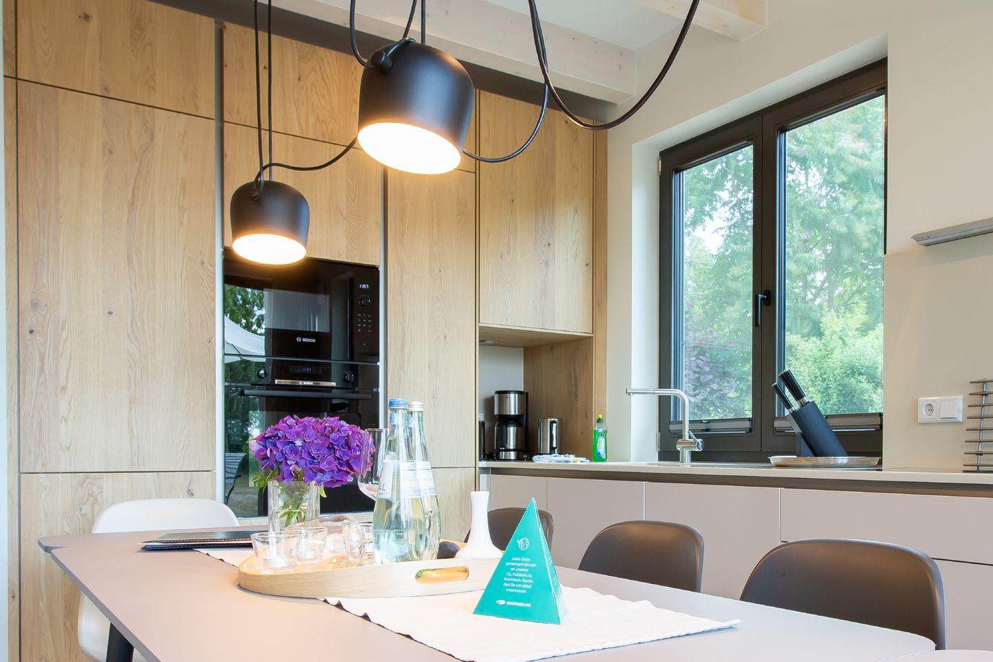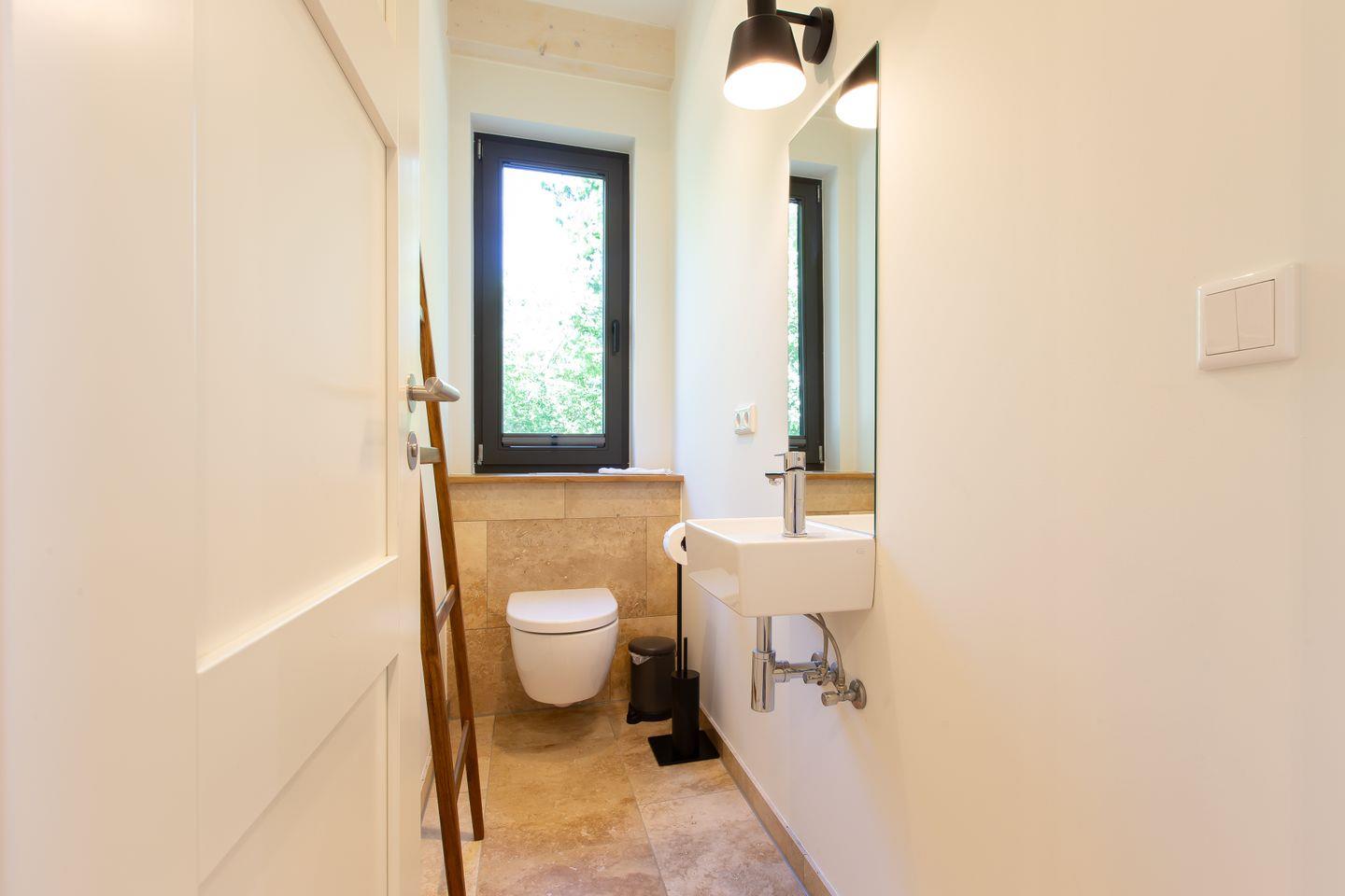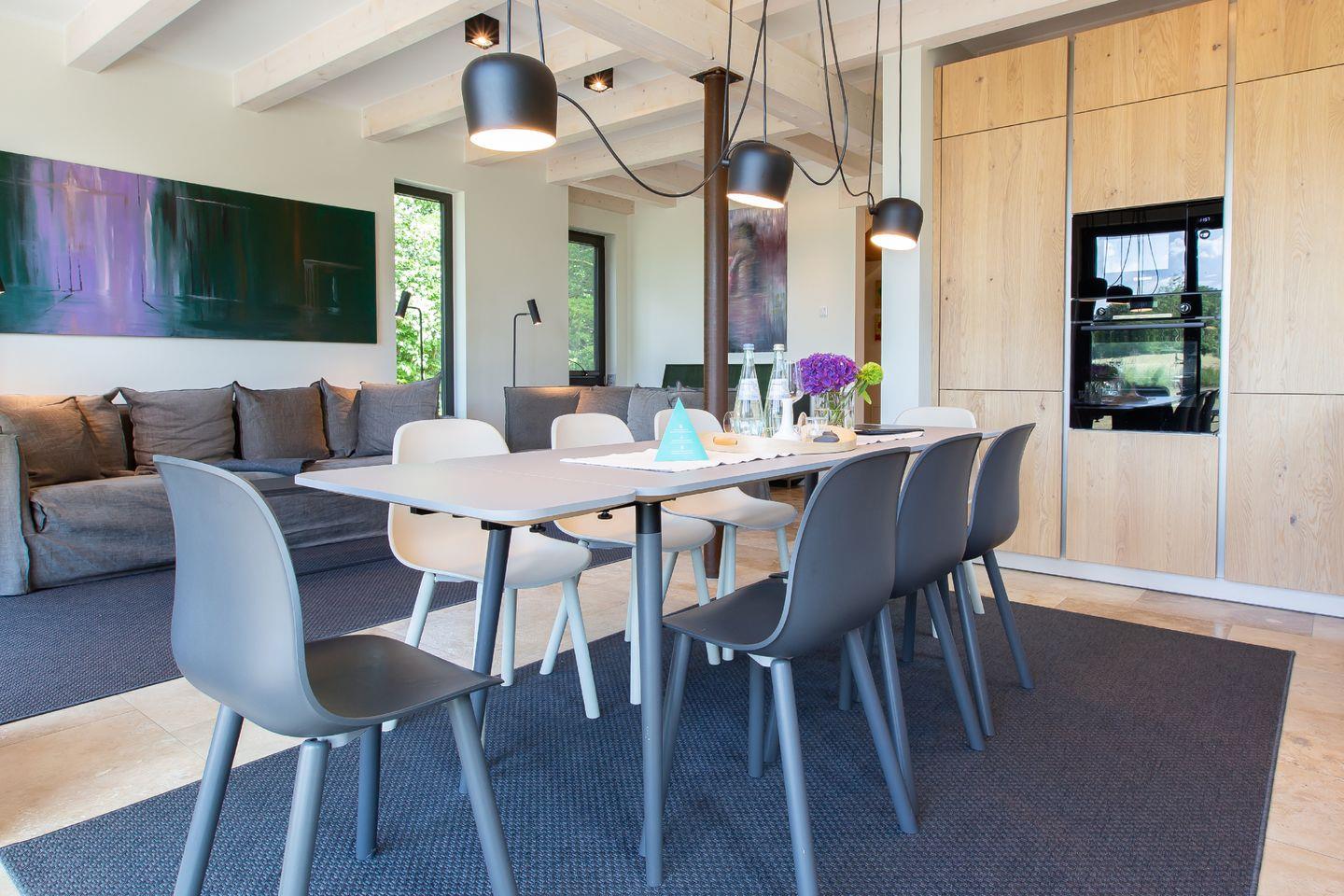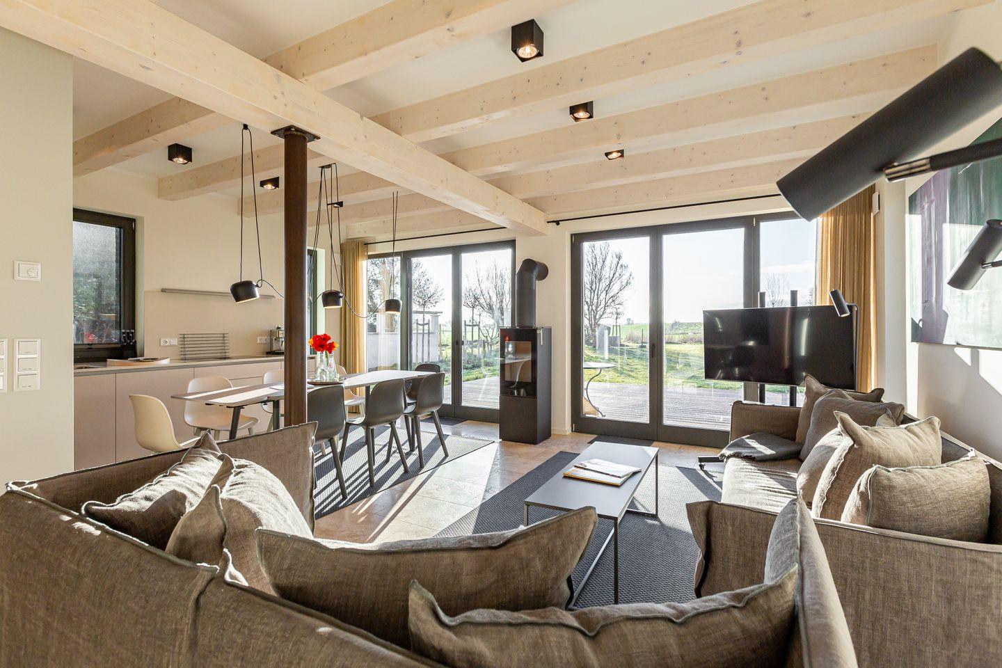 Im Zentrum des Erdgeschosses befindet sich der offen gestaltete Wohn- und Küchenbereich. Optisch abgetrennt durch den Kamin befindet sich zu einer Seite der Sofa- und Loungebereich und zur anderen die top ausgestattete Küche. Sonne und Licht erhellen den Wohnraum dank der bodentiefen Fensterfront und dem ausgeklügelten Beleuchtungssystem. Sichtbare Holzbalken im ganzen Haus schaffen zudem einen gemütlichen Gegensatz zur sonst sehr modernen Einrichtung. Ein erstes Schlafzimmer mit Bad en Suite und ein Gäste-WC befinden sich ebenfalls im Erdgeschoss.