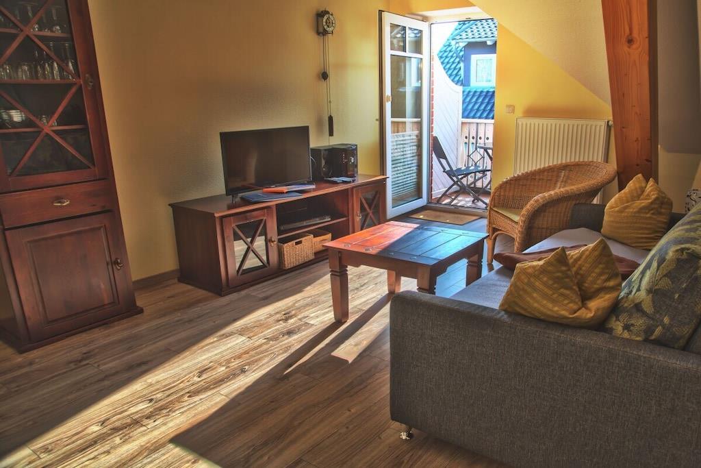 Den nybyggede loftslejlighed på 55 kvadratmeter er egnet til to personer. Den har en stue med åbent køkken, en sovesofa og et separat soveværelse. Alle gæster i vores feriehus i Baabe har adgang til grillområdet med siddepladser i haven. Derudover er der nye aluminiumscykler og adskillige stave til stavgang gratis til rådighed.