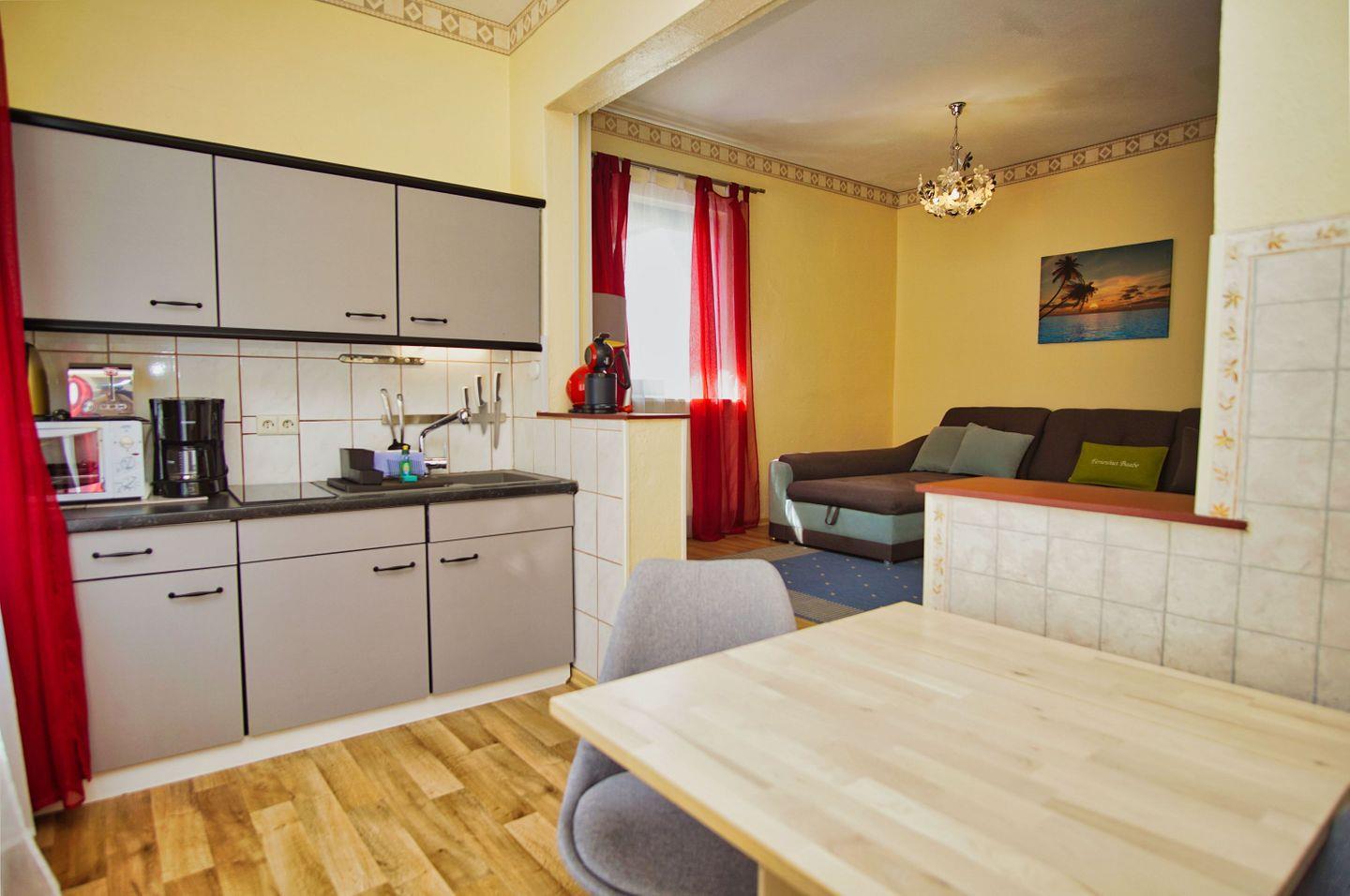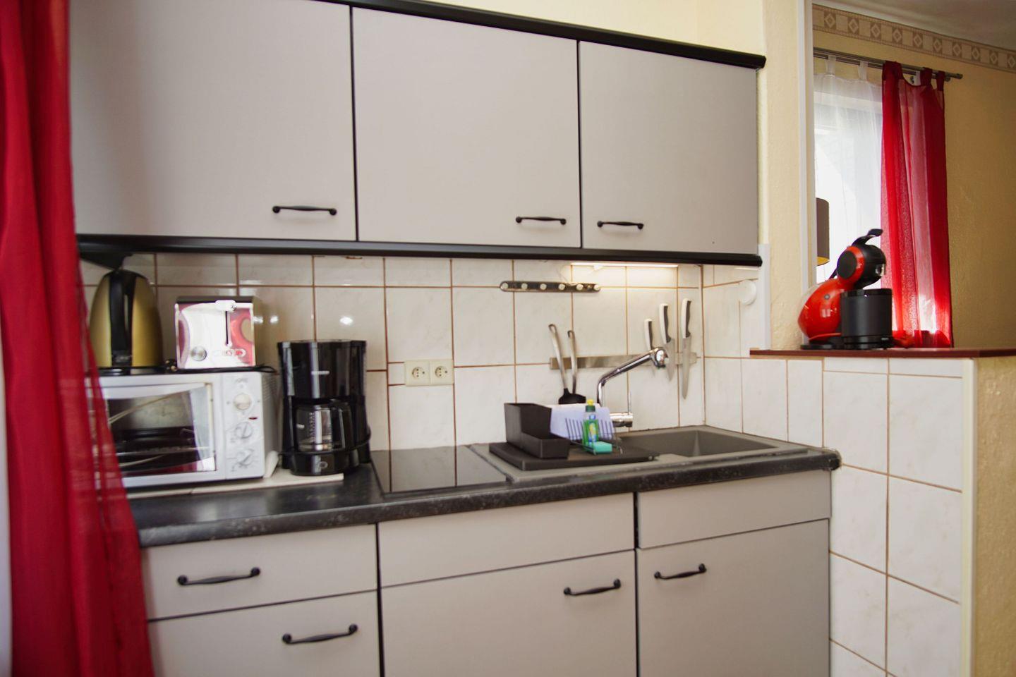 KÜCHE // Küchenzeile, 2-Platten Ceranfeld, Heißluftfritteuse, Kühlschrank mit Gefrierfach, Toaster, Wasserkocher, Kaffeemaschine, reichlich Besteck, Geschirr und Küchenutensilien ++
