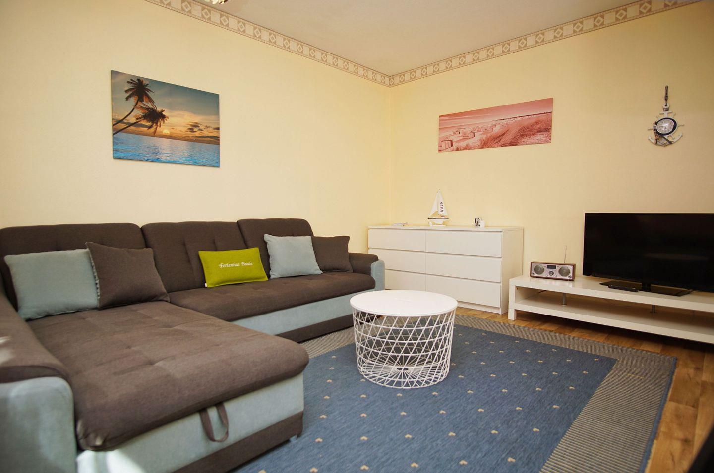 WOHNEN // Wohnraum mit Essbereich, bequeme Couch mit Schlaffunktion, Flachbild-TV ++