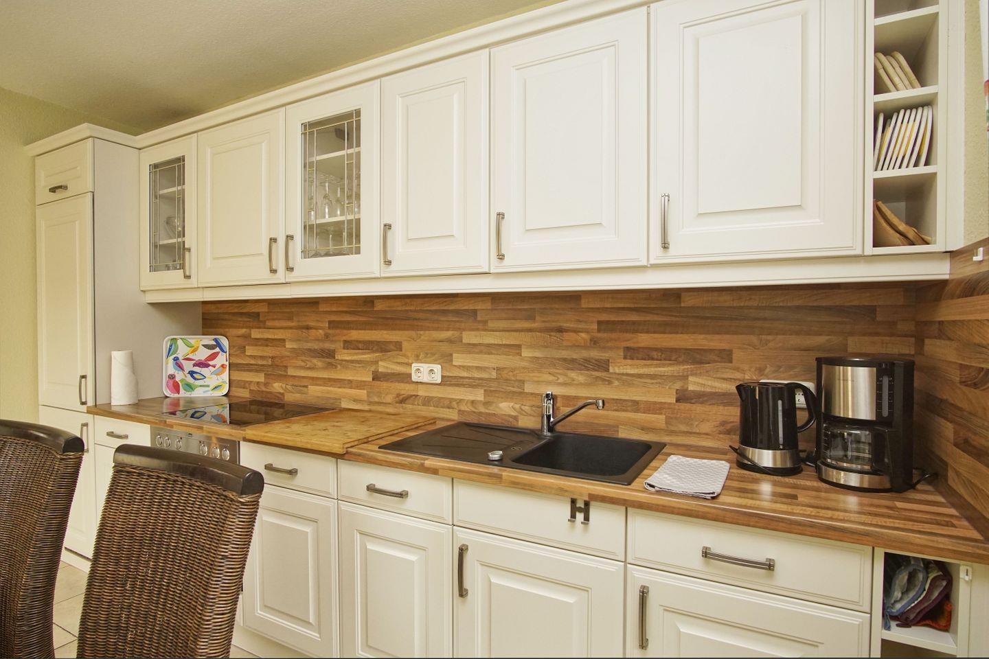 KÜCHE // offene Küche mit Esstisch, Ceranfeld, Spülmaschine, Kühlschrank mit Gefrierfach, Backofen, Toaster, Wasserkocher, Kaffeemaschine, reichlich Besteck, Geschirr und Küchenutensilien ++