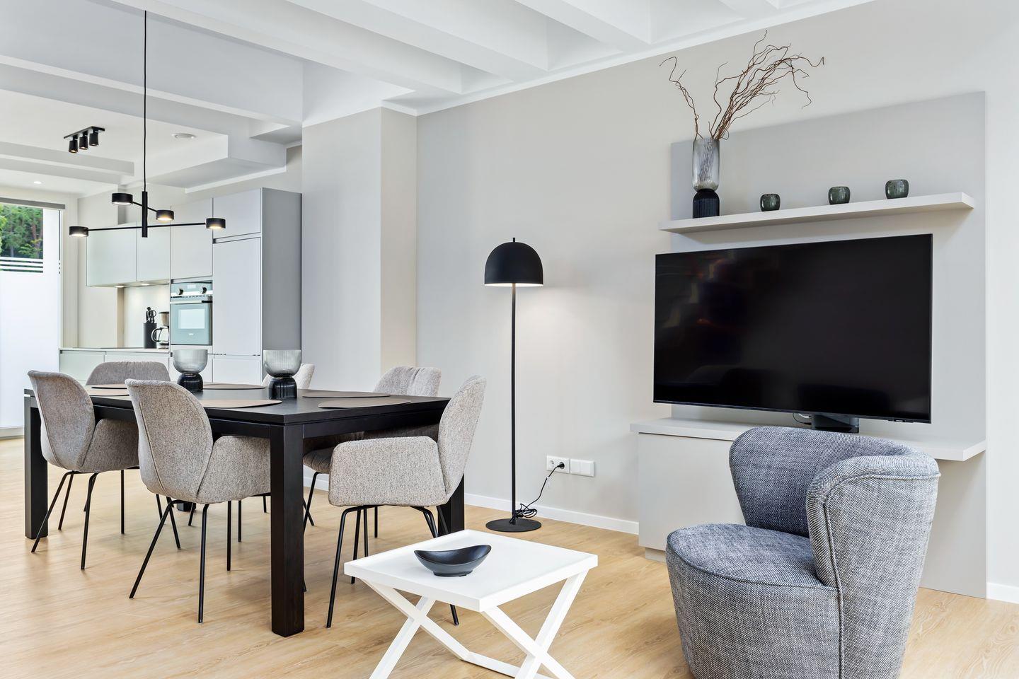 Das geschmackvoll eingerichtete Nichtraucher-Apartment verfügt über Fußbodenheizung, z.T. bodentiefe Fenster, kostenfreies WLAN und eine voll ausgestattete offene Küche mit Geschirrspüler, Kühlschrank mit Gefrierfach, Filterkaffeemaschine, Mixer, Toaster, Wasserkocher, Mikrowelle mit Backofenfunktion und 4-Felder Induktionsherd von BORA sowie über einen behaglichen und großzügigen Wohn-Essbereich. Im Wohnbereich befindet sich ein großer SMART-TV (55 Zoll).