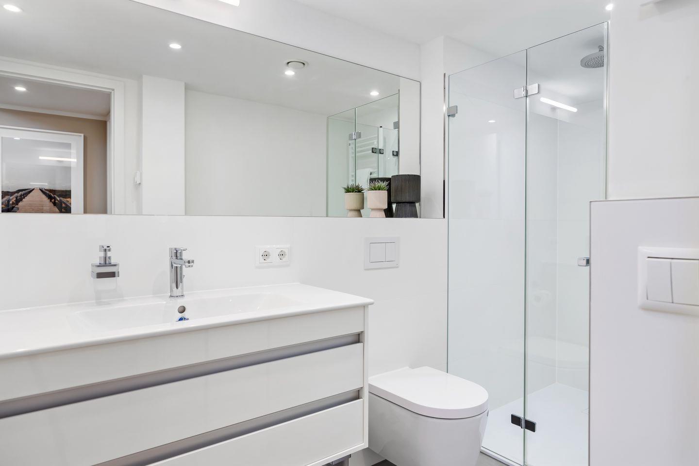 Beide Badezimmer verfügen über Fußbodenheizung, Handtuchwärmer, eine ebenerdige Regendusche, WC, Waschtisch, Föhn und Fenster. Das Apartment verfügt überdies über ein weiteres, separates WC.