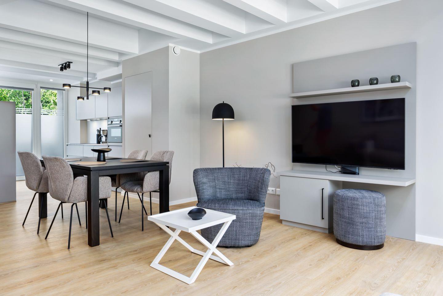 Das geschmackvoll eingerichtete Nichtraucher-Apartment verfügt über Fußbodenheizung, z.T. bodentiefe Fenster, kostenfreies WLAN und eine voll ausgestattete offene Küche mit Geschirrspüler, Kühlschrank mit Gefrierfach, Filterkaffeemaschine, Mixer, Toaster, Wasserkocher, Mikrowelle mit Backofenfunktion und 4-Felder Induktionsherd von BORA sowie über einen behaglichen und großzügigen Wohn-Essbereich. Im Wohnbereich befindet sich ein großer SMART-TV (55 Zoll).