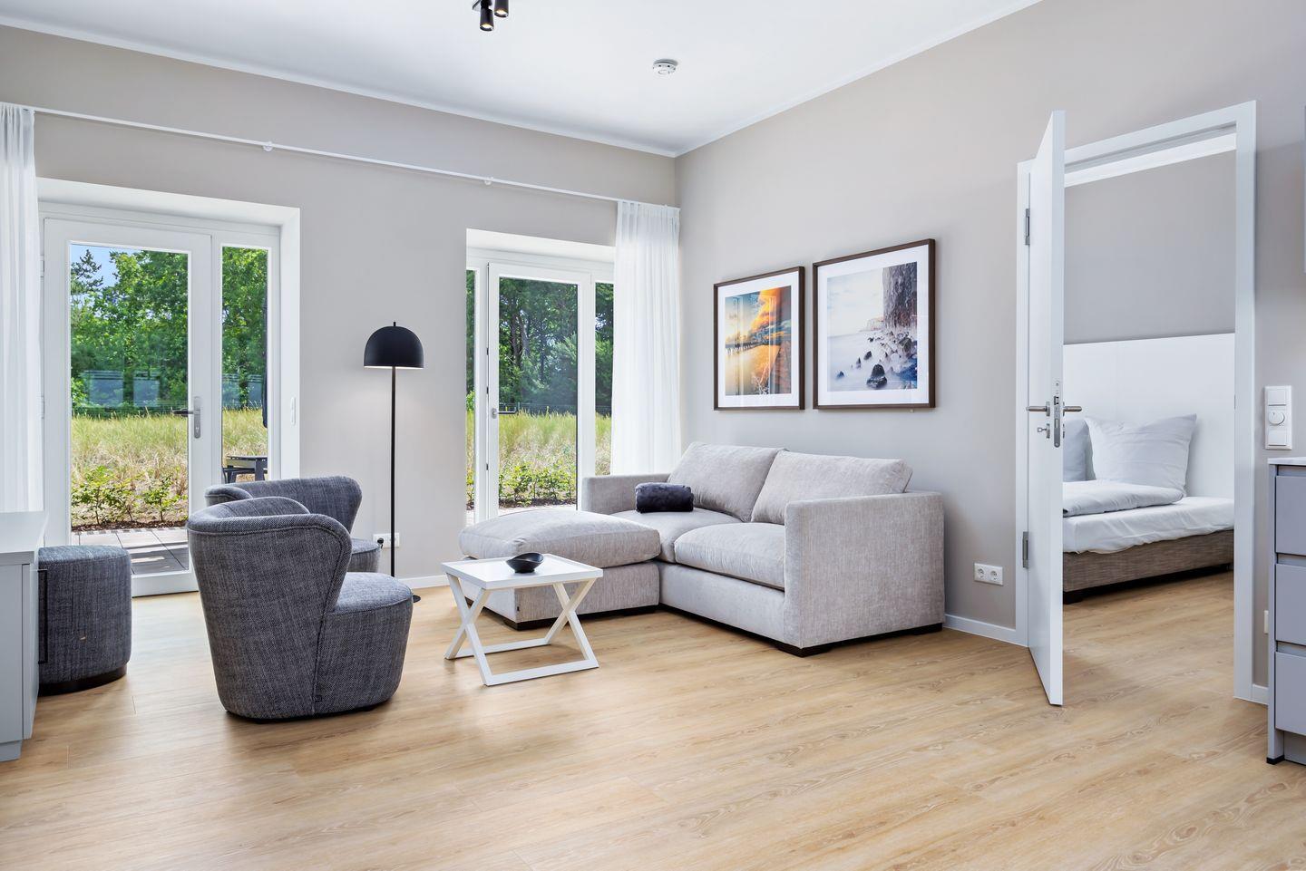 Das lichtdurchflutete Apartment befindet sich in nordöstlicher Lage im Erdgeschoss des Hauses Dänholm. Die Ostsee liegt vor der Haustür - in nur 130 Metern erreicht ihr den feinsandigen, kilometerlangen Südstrand. In der Umgebung warten zahlreiche Ausflugsmöglichkeiten auf euren Besuch: Das Dokumentationszentrum Prora, das Prora-Zentrum, das Oldtimer-Museum Rügen, das NVA-Museum Rügen, die Galileo Wissenswelt Rügen, der Kletterwald Binz-Prora und das Naturerbe Zentrum Rügen mit dem Baumwipfel-Pfad sowie das beliebte Karls Erlebnis-Dorf in Zirkow. Fußläufig befinden sich zwei Bäckereien, einige Bistros sowie ein Restaurant, kleine Mode- und Souvenirgeschäfte als auch ein Fahrradverleih. Eine Segelschule befindet sich in ca. 3 km Entfernung. Im nahe gelegenen Dormero Strandhotel (ca. 800 m) könnt ihr Tagestickets erwerben und den Pool, die Sauna und den Fitnessbereich nach Herzenslust genießen.