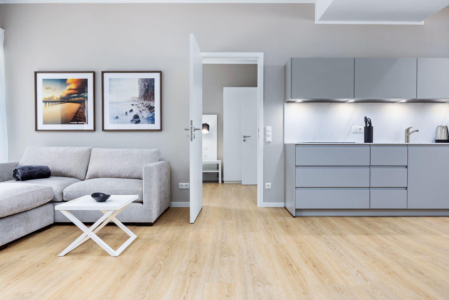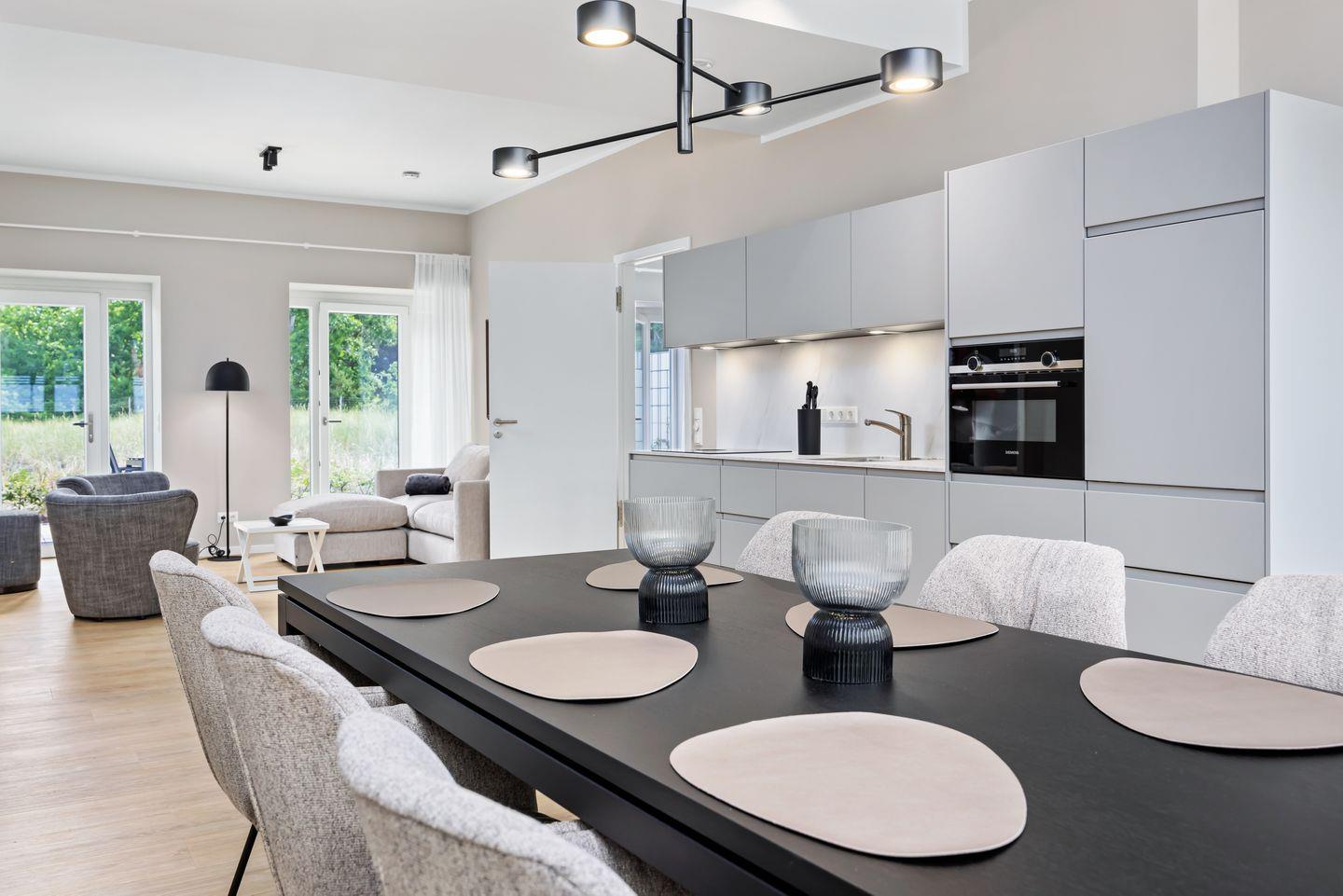 Das geschmackvoll eingerichtete Nichtraucher-Apartment verfügt über Fußbodenheizung, z.T. bodentiefe Fenster, kostenfreies WLAN und eine voll ausgestattete offene Küche mit Geschirrspüler, Kühlschrank mit Gefrierfach, Filterkaffeemaschine, Mixer, Toaster, Wasserkocher, Mikrowelle mit Backofenfunktion und4-Felder Induktionsherd von BORA sowie über einen behaglichen und großzügigen Wohn-Essbereich. Im Wohnbereich befindet sich ein großer SMART-TV (55 Zoll).