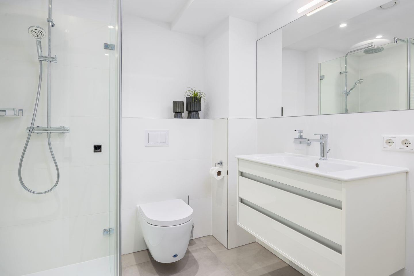 Das stilvolle Badezimmer verfügt über Fußbodenheizung, Handtuchwärmer, eine ebenerdige Regendusche, WC, Waschtisch und Föhn. Das Apartment verfügt über ein weiteres, separates WC.