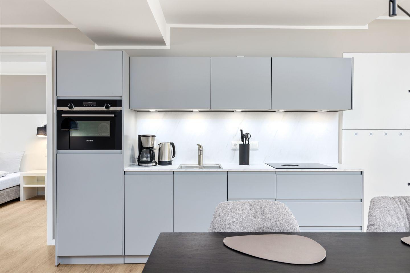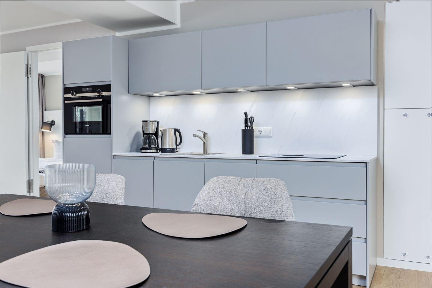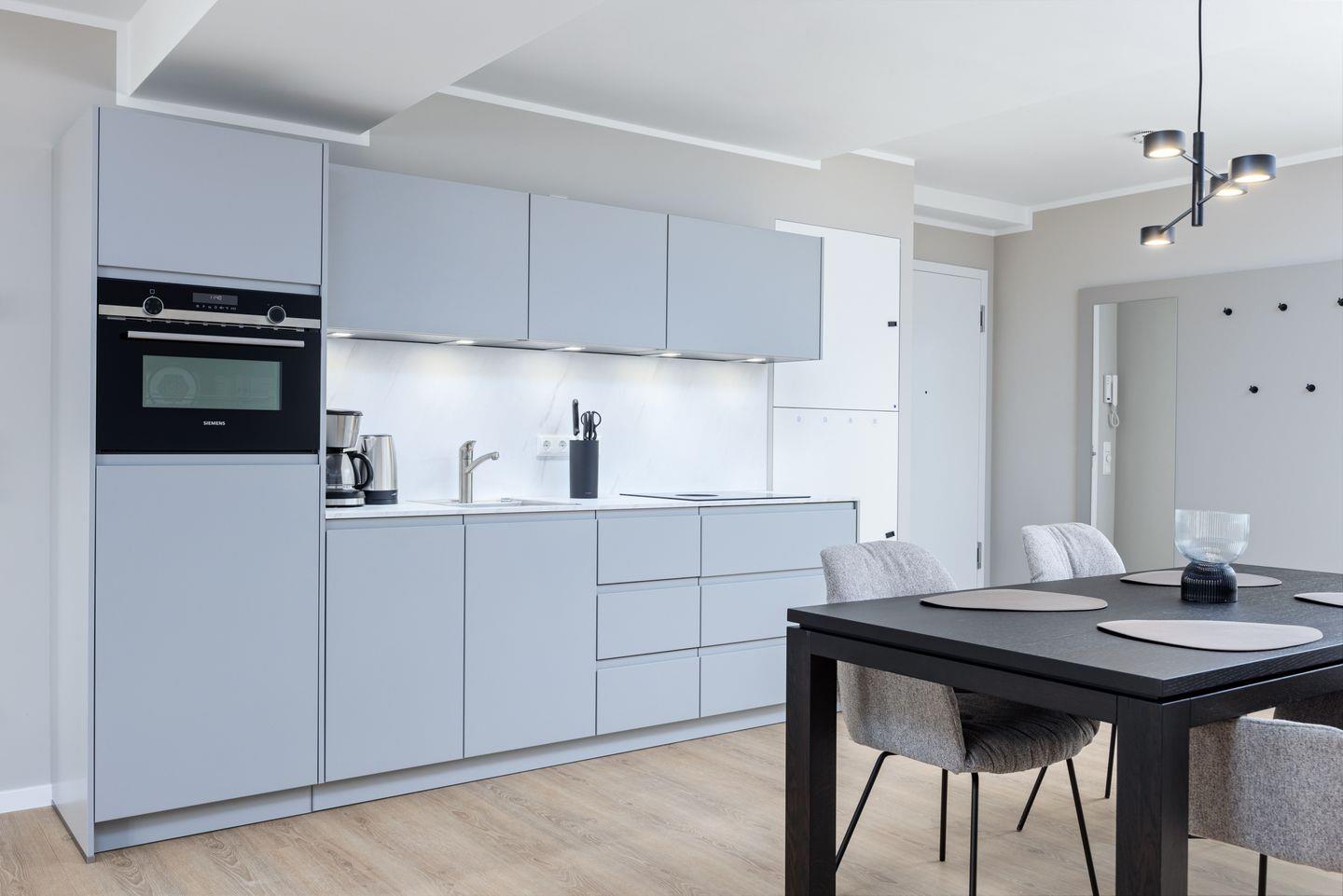 Das geschmackvoll eingerichtete Nichtraucher-Apartment verfügt über Fußbodenheizung, z.T. bodentiefe Fenster, kostenfreies WLAN und eine voll ausgestattete offene Küche mit Geschirrspüler, Kühlschrank mit Gefrierfach, Filterkaffeemaschine, Mixer, Toaster, Wasserkocher, Mikrowelle mit Backofenfunktion und4-Felder Induktionsherd von BORA sowie über einen behaglichen und großzügigen Wohn-Essbereich. Im Wohnbereich befinden sich ein großer SMART-TV (55 Zoll) und eine Doppelschlafcouch (1,60 x 2,00 m).