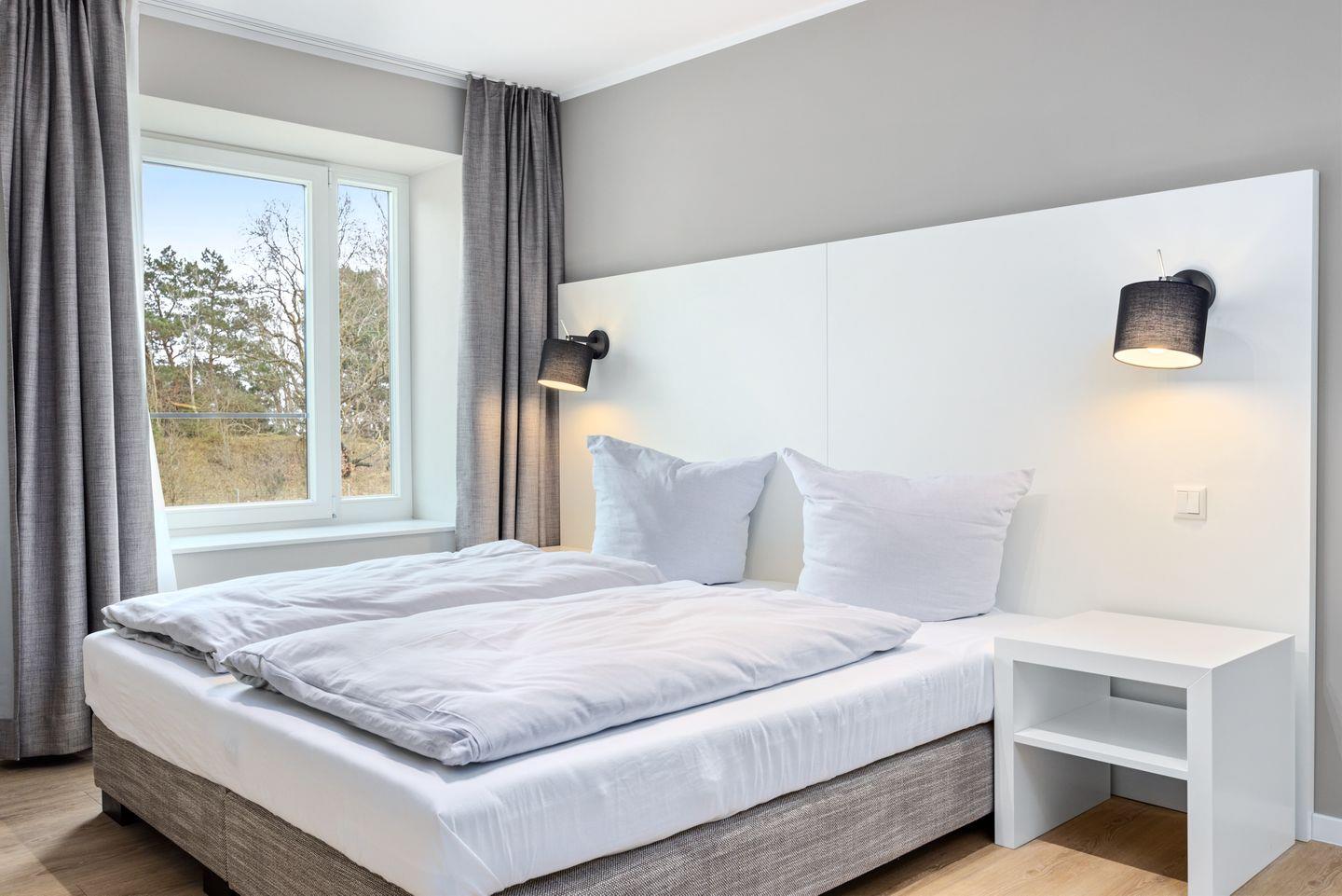 Das separate Schlafzimmer beinhaltet ein modernes Boxspring-Doppelbett (1,80 x 2,00 m), einen eigenen SMART-TV (43 Zoll) und einen Kleiderschrank. Das Badezimmer ist dem Schlafzimmer direkt angeschlossen und auch nur über dieses zugänglich. Das Bad verfügt über Fußbodenheizung, Handtuchwärmer, eine ebenerdige Regendusche, WC, Waschtisch und Föhn.