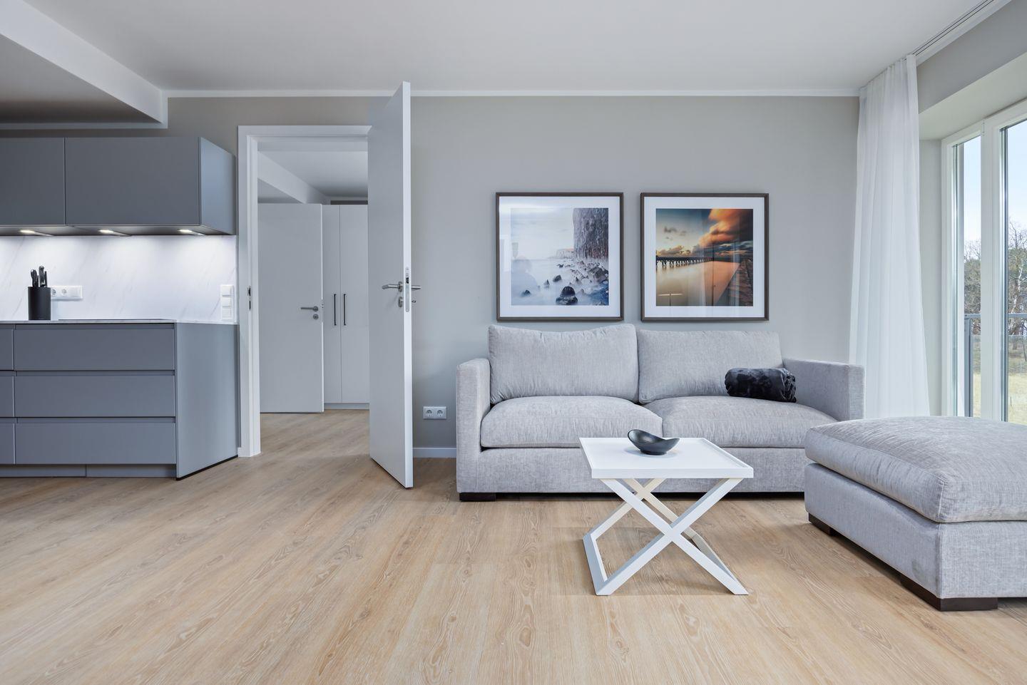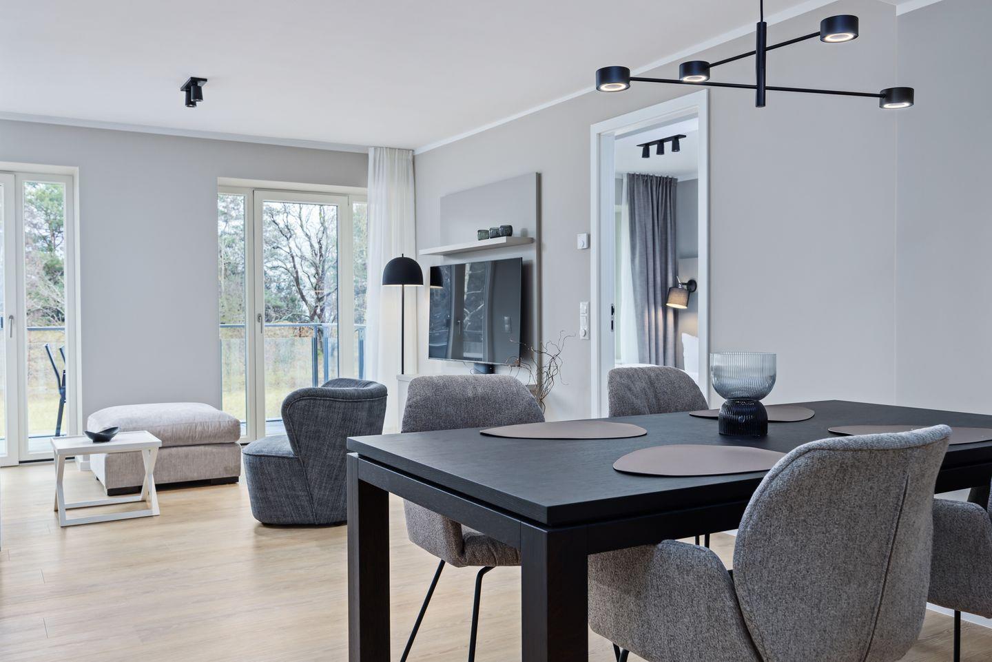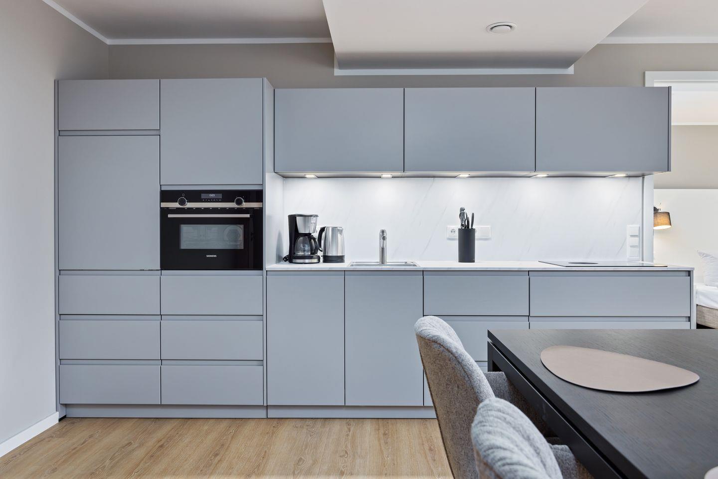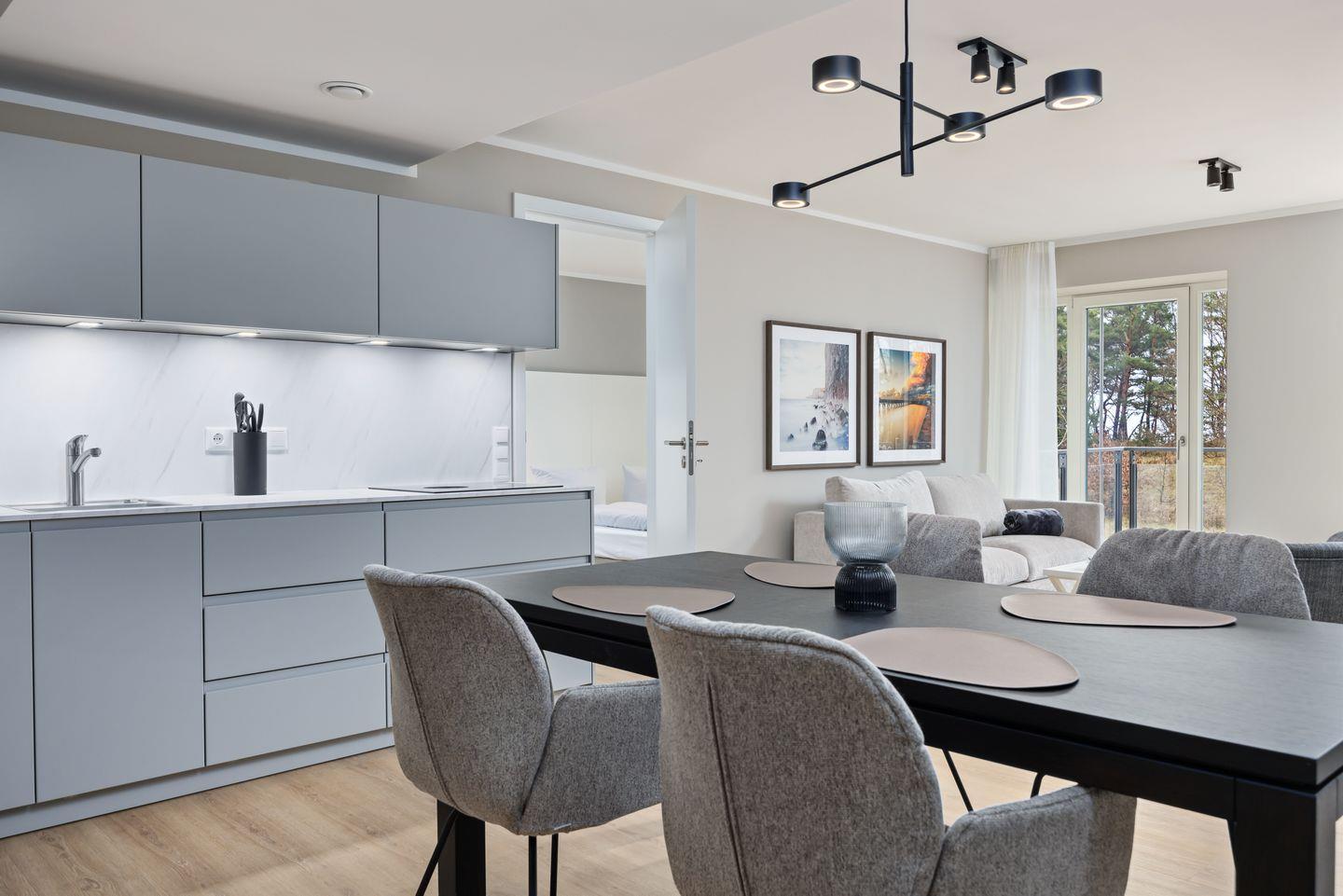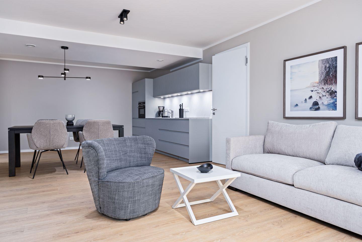 Das geschmackvoll eingerichtete Nichtraucher-Apartment verfügt über Fußbodenheizung, z.T. bodentiefe Fenster, kostenfreies WLAN und eine voll ausgestattete offene Küche mit Geschirrspüler, Kühlschrank mit Gefrierfach, Filterkaffeemaschine, Mixer, Toaster, Wasserkocher, Mikrowelle mit Backofenfunktion und 4-Felder Induktionsherd von BORA sowie über einen behaglichen und großzügigen Wohn-Essbereich. Im Wohnbereich befindet sich ein großer SMART-TV (55 Zoll).