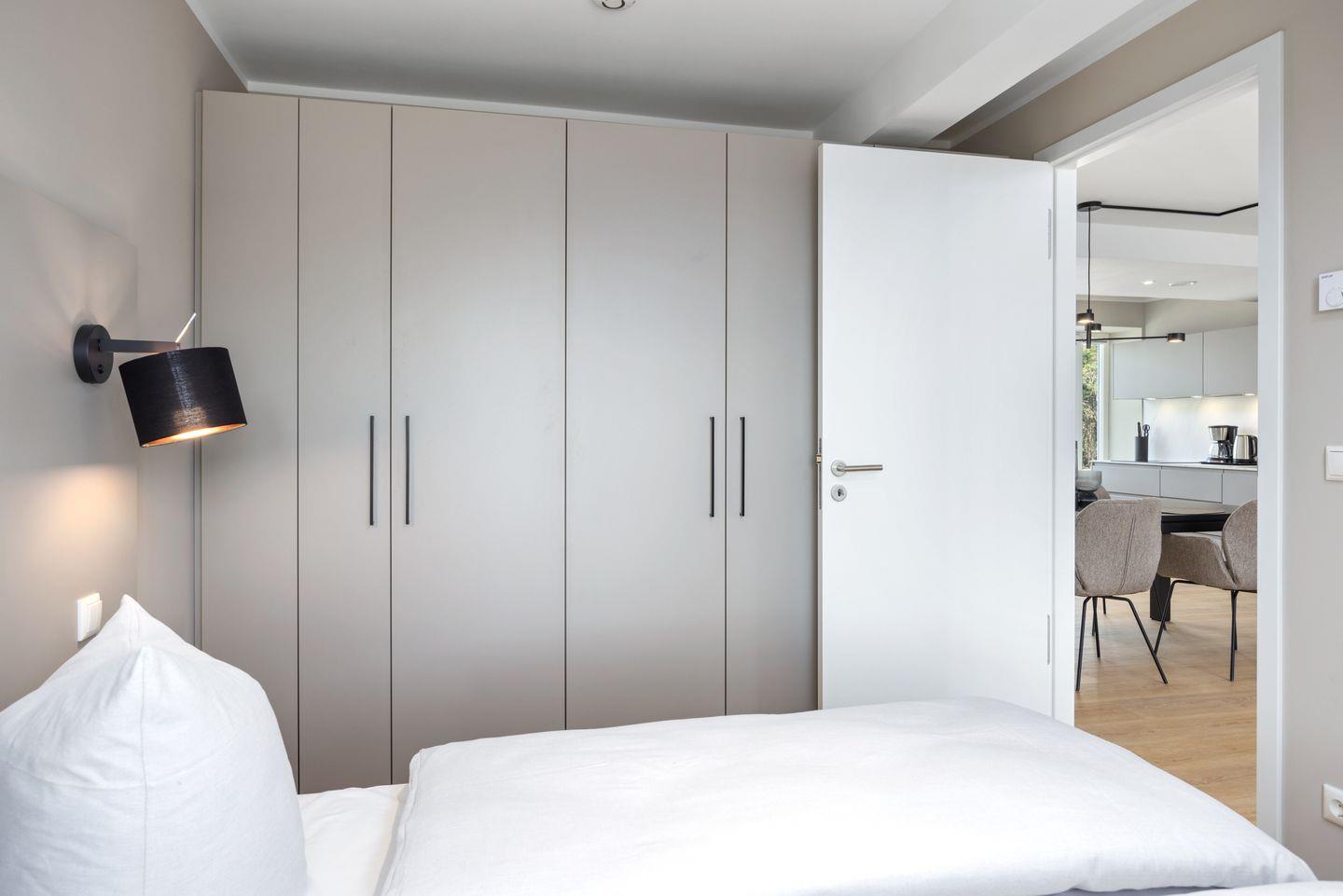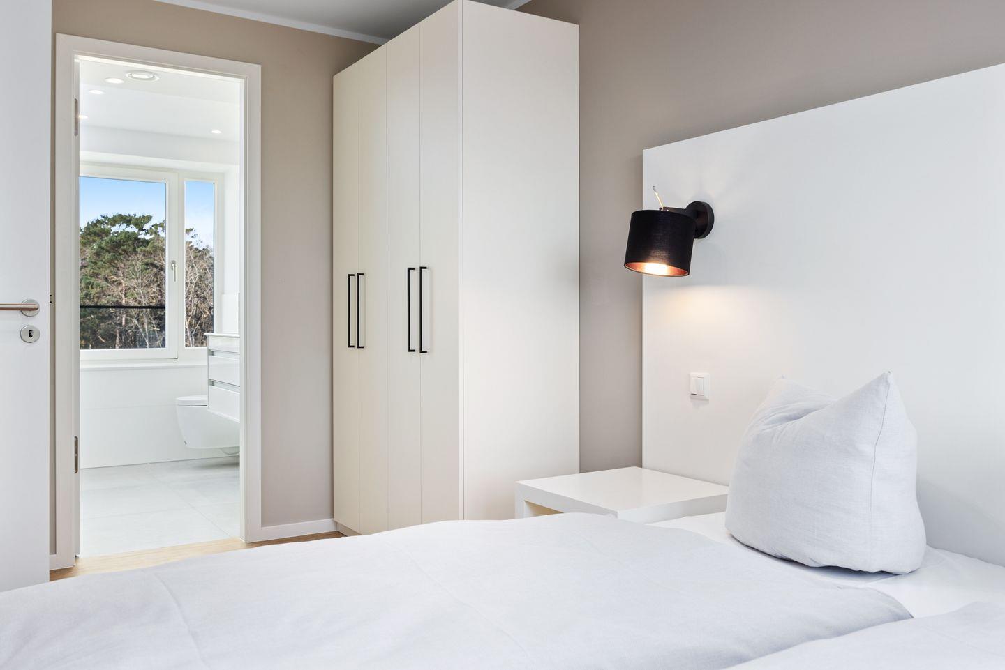 Beide Schlafzimmer beinhalten jeweils ein modernes Boxspring-Doppelbett (1,80 x 2,00 m bzw. 1,60 x 2,00 m), Kleiderschrank und bieten den Luxus eines jeweils eigenen Badezimmers! Eines der Schlafzimmer verfügt überdies über einen eigenen SMART-TV (43 Zoll). In den stilvollen Badezimmern mit Tageslicht befinden sich Fußbodenheizung, Handtuchwärmer, eine ebenerdige Regendusche, WC, Waschtisch, Föhn und Fenster.