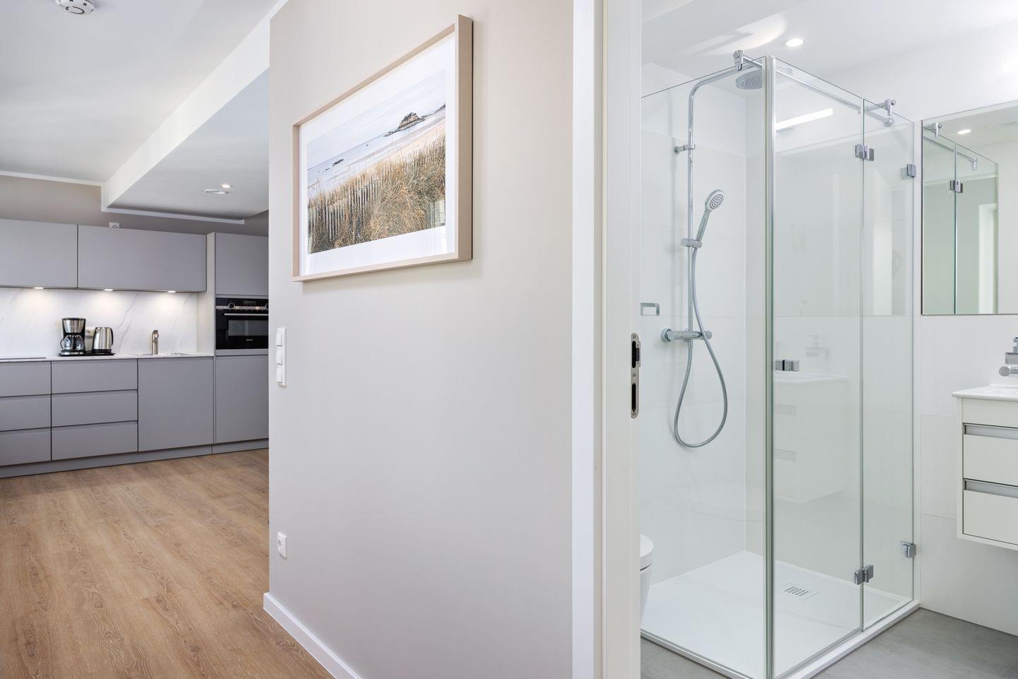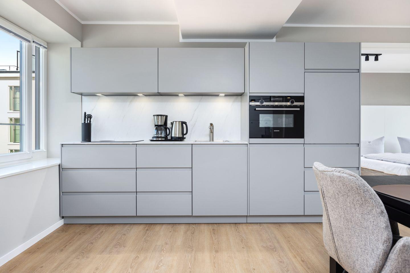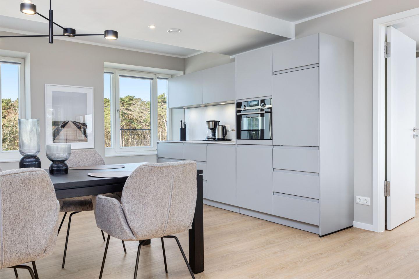 Das geschmackvoll eingerichtete Nichtraucher-Apartment verfügt über Fußbodenheizung, z.T. bodentiefe Fenster, kostenfreies WLAN und eine voll ausgestattete offene Küche mit Geschirrspüler, Kühlschrank mit Gefrierfach, Filterkaffeemaschine, Mixer, Toaster, Wasserkocher, Mikrowelle mit Backofenfunktion und 4-Felder Induktionsherd von BORA sowie über einen behaglichen und großzügigen Wohn-Essbereich. Im Wohnbereich befindet sich ein großer SMART-TV (55 Zoll).