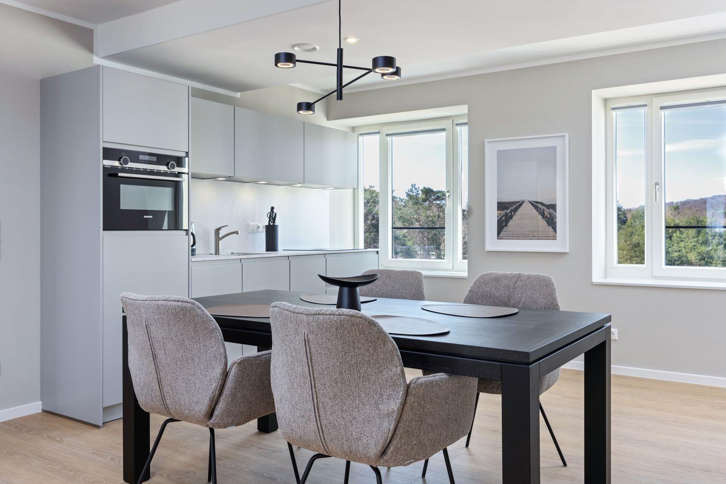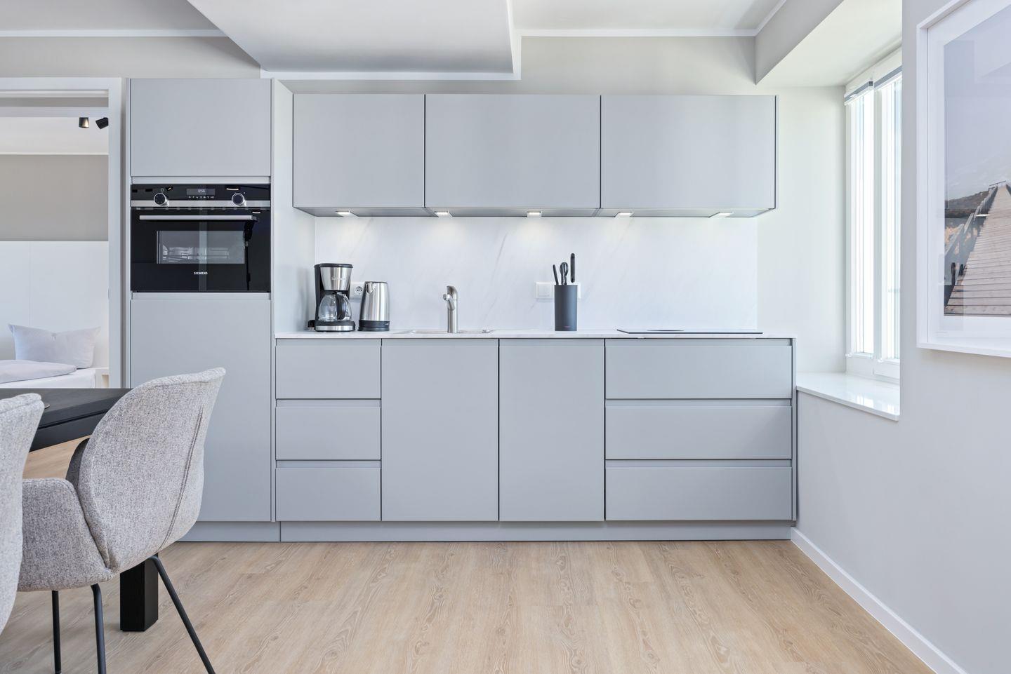 Das geschmackvoll eingerichtete Nichtraucher-Apartment verfügt über Fußbodenheizung, z.T. bodentiefe Fenster, kostenfreies WLAN und eine voll ausgestattete offene Küche mit Geschirrspüler, Kühlschrank mit Gefrierfach, Filterkaffeemaschine, Mixer, Toaster, Wasserkocher, Mikrowelle mit Backofenfunktion und 4-Felder Induktionsherd von BORA sowie über einen behaglichen und großzügigen Wohn-Essbereich. Im Wohnbereich befindet sich ein großer SMART-TV (55 Zoll).