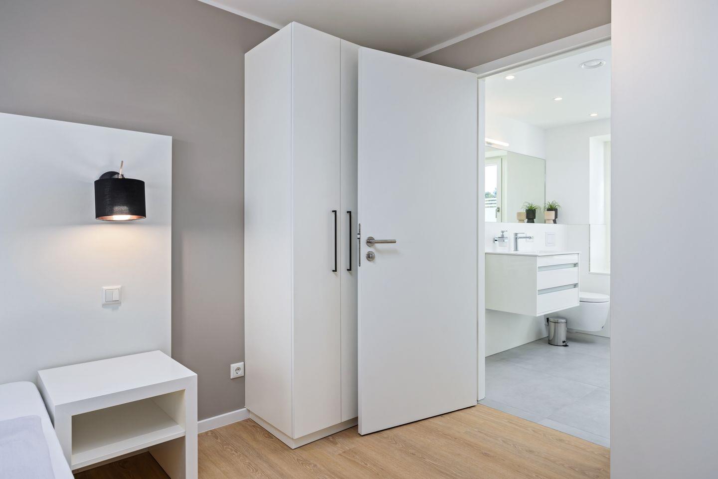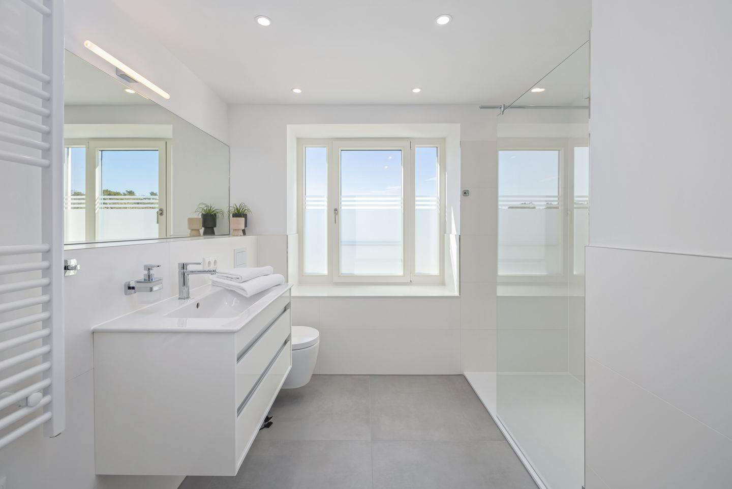Beide Schlafzimmer beinhalten jeweils ein modernes Boxspring-Doppelbett (1,80 x 2,00 m bzw. 1,60 x 2,00 m), Kleiderschrank und bieten den Luxus eines jeweils eigenen Badezimmers! Eines der Schlafzimmer verfügt überdies über einen eigenen SMART-TV (43 Zoll). In beiden stilvollen Badezimmern befinden sich Fußbodenheizung, Handtuchwärmer, eine ebenerdige Regendusche, WC, Waschtisch und Föhn.