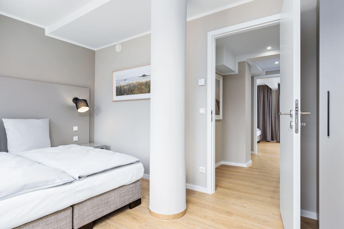 Beide Schlafzimmer beinhalten jeweils ein modernes Boxspring-Doppelbett (1,80 x 2,00 m bzw. 1,60 x 2,00 m) und einen Kleiderschrank. Eines der Schlafzimmer verfügt über einen eigenen SMART-TV (43 Zoll). Das stilvolle Badezimmer verfügt über Fußbodenheizung, Handtuchwärmer, eine ebenerdige Regendusche, WC, Waschtisch und Föhn. Das Apartment verfügt über ein zweites, separates WC.