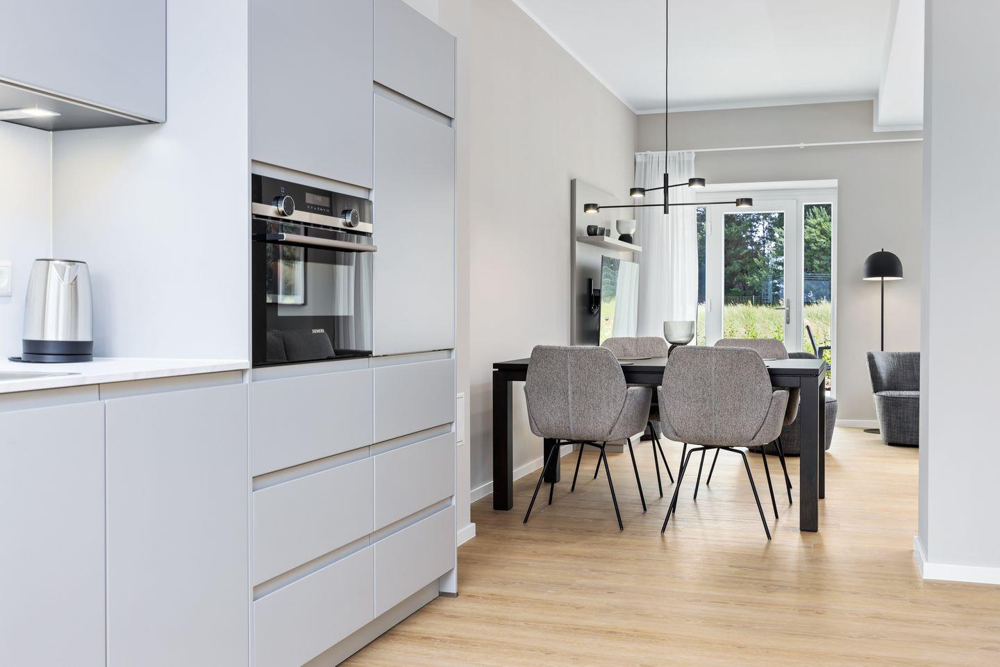 Das geschmackvoll eingerichtete Nichtraucher-Apartment verfügt über Fußbodenheizung, z.T. bodentiefe Fenster, kostenfreies WLAN und eine voll ausgestattete offene Küche mit Geschirrspüler, Kühlschrank mit Gefrierfach, Filterkaffeemaschine, Mixer, Toaster, Wasserkocher, Mikrowelle mit Backofenfunktion und 4-Felder Induktionsherd von BORA sowie über einen behaglichen und großzügigen Wohn-Essbereich. Im Wohnbereich befindet sich ein großer SMART-TV (55 Zoll).
