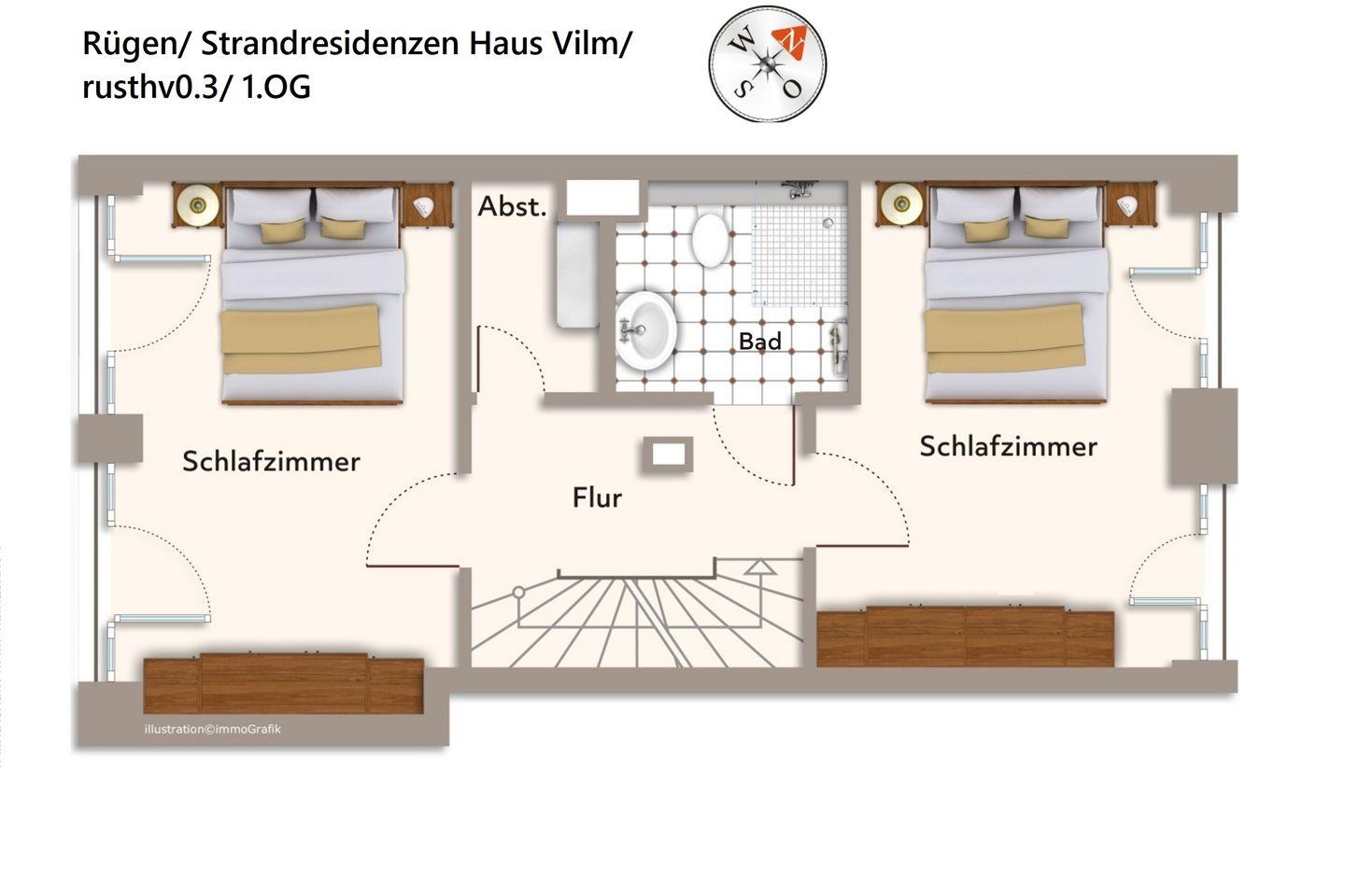 Das lichtdurchflutete Apartment befindet sich in nordöstlicher Lage und verläuft über zwei Wohnebenen, die im Erdgeschoss und im ersten Obergeschoss des Hauses Vilm liegen. Die Ostsee liegt vor der Haustür - in nur 130 Metern erreicht ihr den feinsandigen, kilometerlangen Südstrand. In der Umgebung warten zahlreiche Ausflugsmöglichkeiten auf euren Besuch: Das Dokumentationszentrum Prora, das Prora-Zentrum, das Oldtimer-Museum Rügen, das NVA-Museum Rügen, die Galileo Wissenswelt Rügen, der Kletterwald Binz-Prora und das Naturerbe Zentrum Rügen mit dem Baumwipfel-Pfad sowie das beliebte Karls Erlebnis-Dorf in Zirkow. Fußläufig befinden sich zwei Bäckereien, einige Bistros sowie ein Restaurant, kleine Mode- und Souvenirgeschäfte als auch ein Fahrradverleih. Eine Segelschule befindet sich in ca. 3 km Entfernung. Im nahe gelegenen Dormero Strandhotel (ca. 800 m) könnt ihr Tagestickets erwerben und den Pool, die Sauna und den Fitnessbereich nach Herzenslust genießen.
