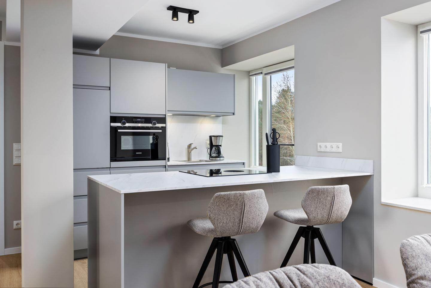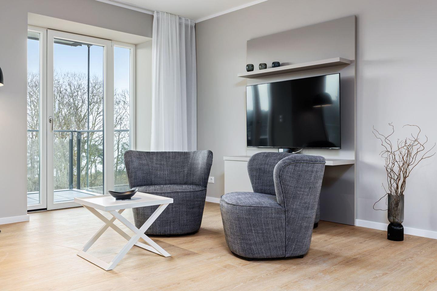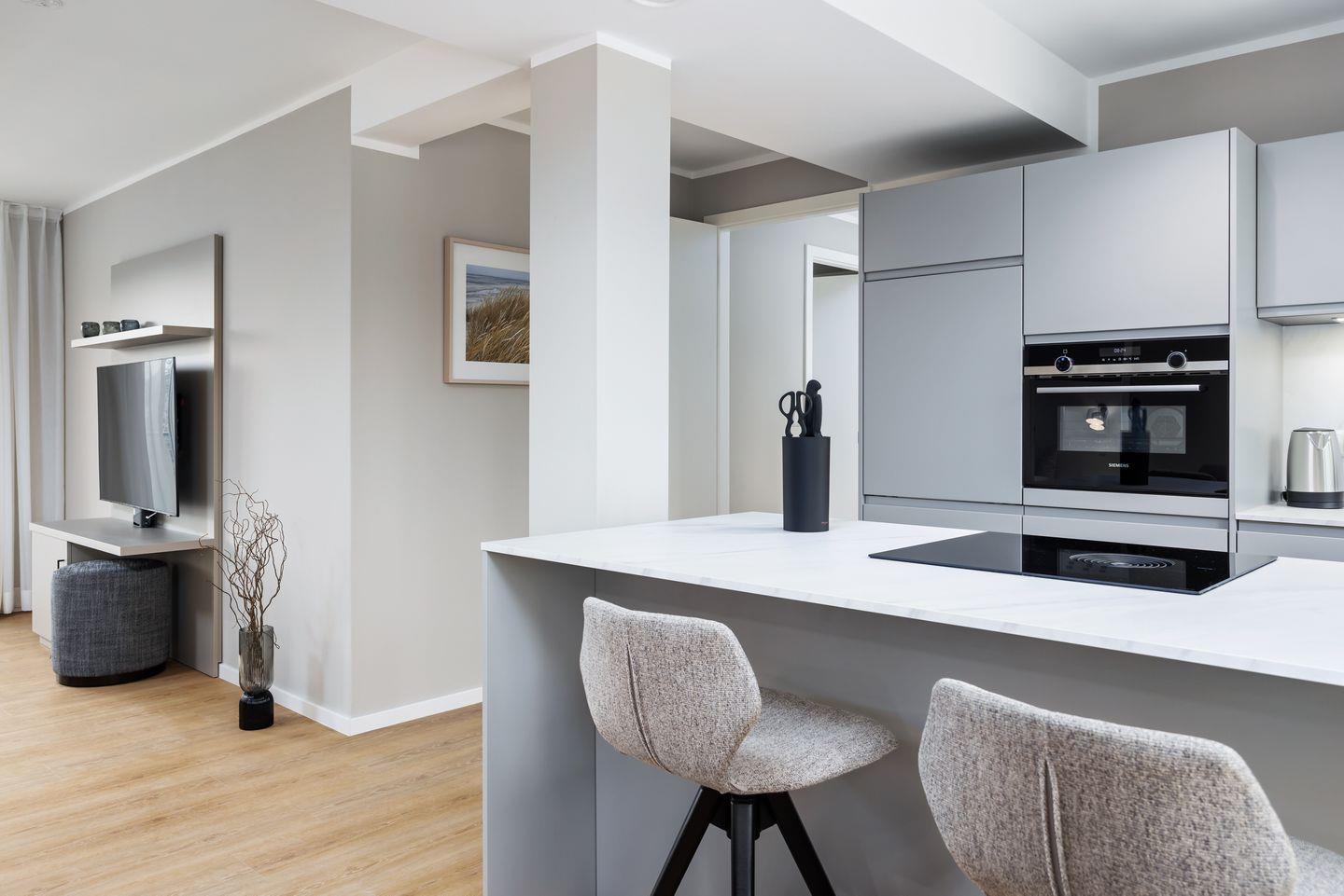 Das geschmackvoll eingerichtete Nichtraucher-Apartment verfügt über Fußbodenheizung, z.T. bodentiefe Fenster, kostenfreies WLAN und eine voll ausgestattete offene Küche mit Geschirrspüler, Kühlschrank mit Gefrierfach, Filterkaffeemaschine, Mixer, Toaster, Wasserkocher, Mikrowelle mit Backofenfunktion und 4-Felder Induktionsherd von BORA sowie über einen behaglichen und großzügigen Wohn-Essbereich. Im Wohnbereich befindet sich ein großer SMART-TV (55 Zoll).