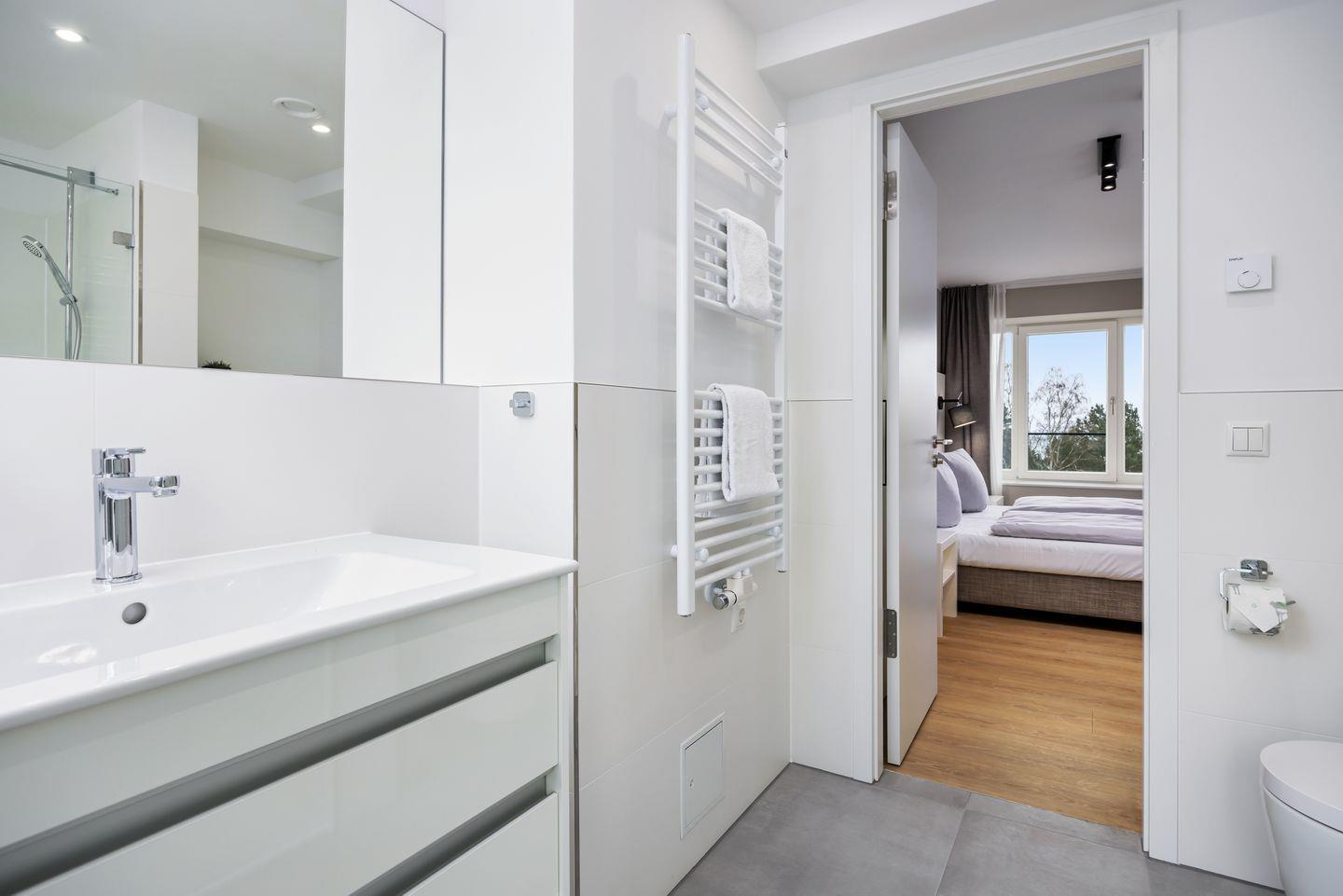 In diesem Apartment ist ein hohes Maß an Privatsphäre gewährleistet; es stehen euch drei separate Schlafzimmer zur Verfügung. Das größte der drei Schlafzimmer bietet dabei einen besonders hohen Komfort durch ein eigenes Badezimmer, ein modernes Boxspring-Doppelbett (1,80 x 2,00 m), Kleiderschrank und einen eigenen SMART-TV (43 Zoll). In den weiteren Schlafzimmern befinden sich ein komfortables Boxspring-Doppelbett (1,80 x 2,00 m) und ein Kleiderschrank bzw. ein Boxspring-Einzelbett (0,90 x 2,00 m) und ein kleiner Schreibtisch sowie ebenfalls ein Kleiderschrank.