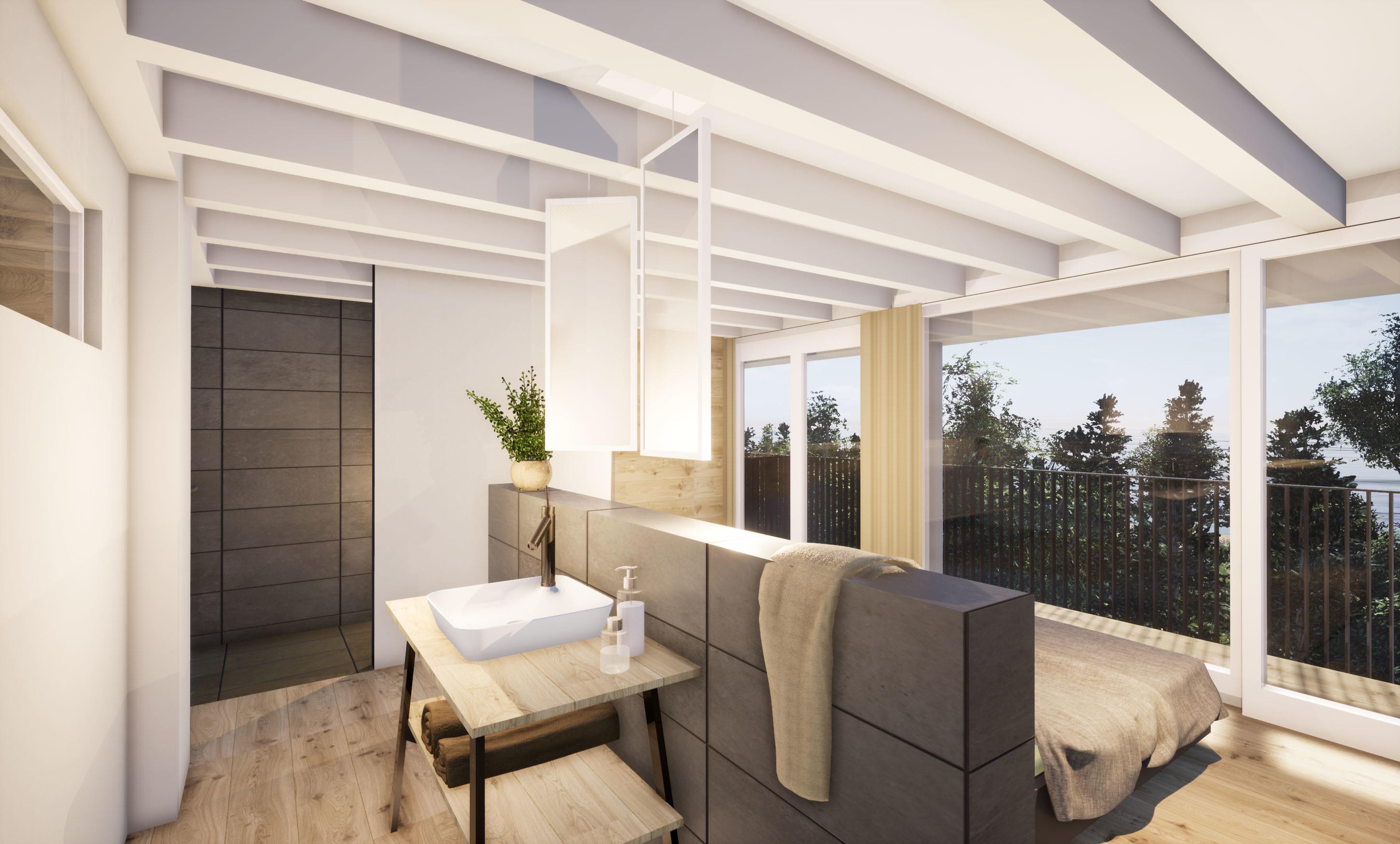 3 Schlafzimmer mit Doppelbett, 1 Schlafzimmer mit Etagenbett, 3 Bäder, eine Sauna mit Whirlpool, Kamin und Dachterrasse mit herrlichem Ausblick.
