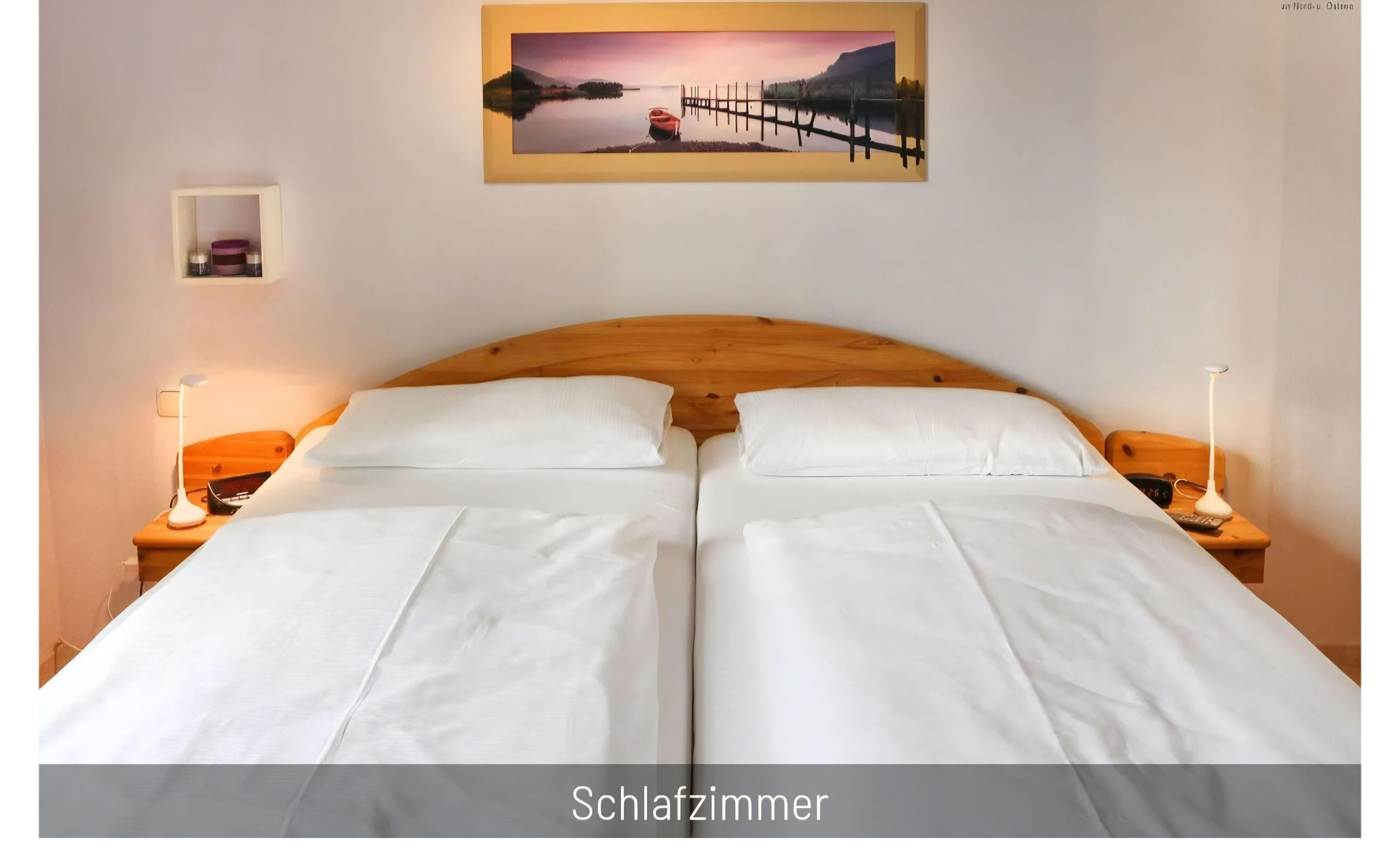 Das Schlafzimmer ist mit einem Doppelbett (180 x 200 cm), einem großen Kleiderschrank und zwei Nachttischchen möbeliert. An der Wand ist ein zweiter Flat-Screen angebracht.