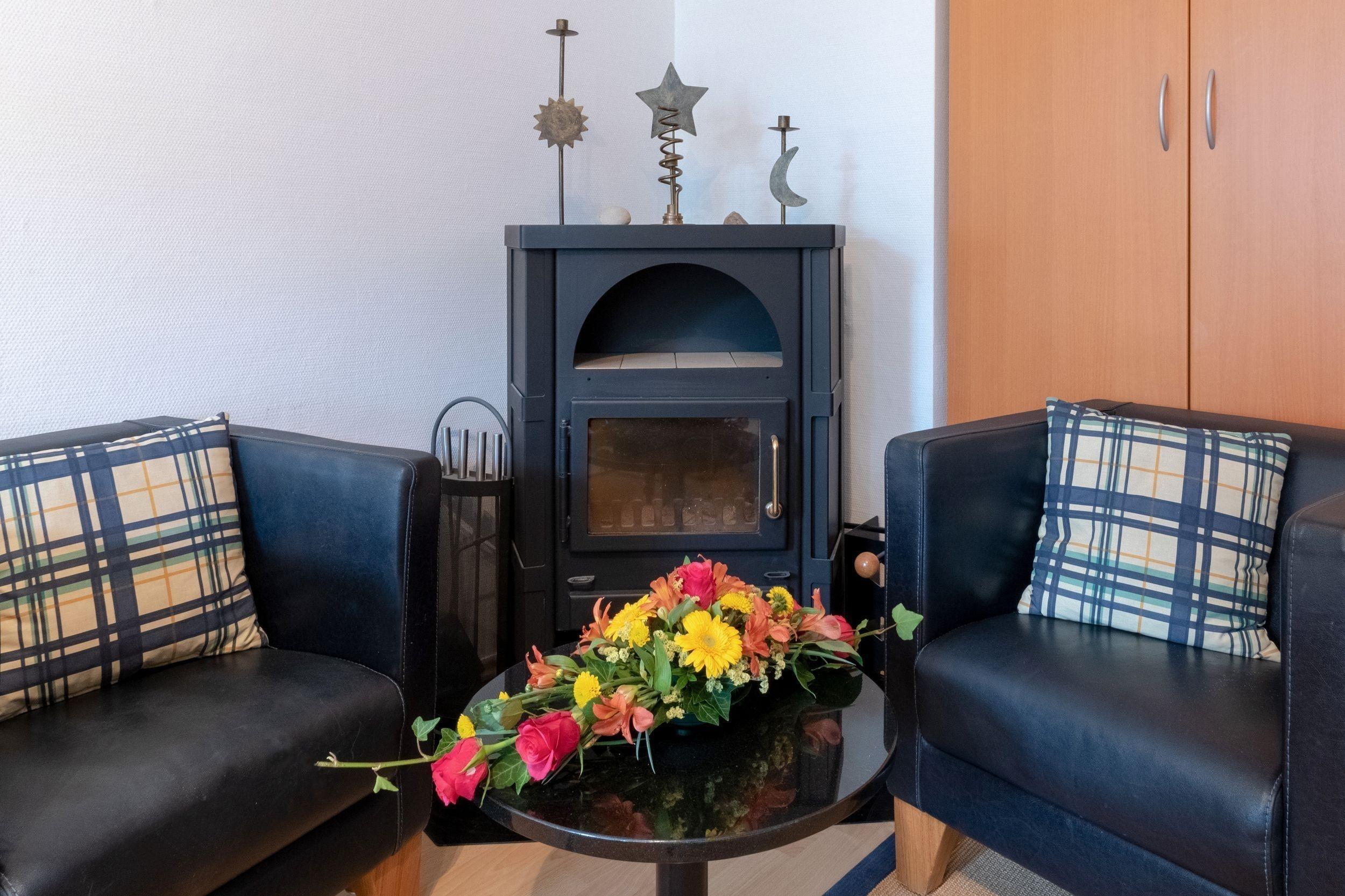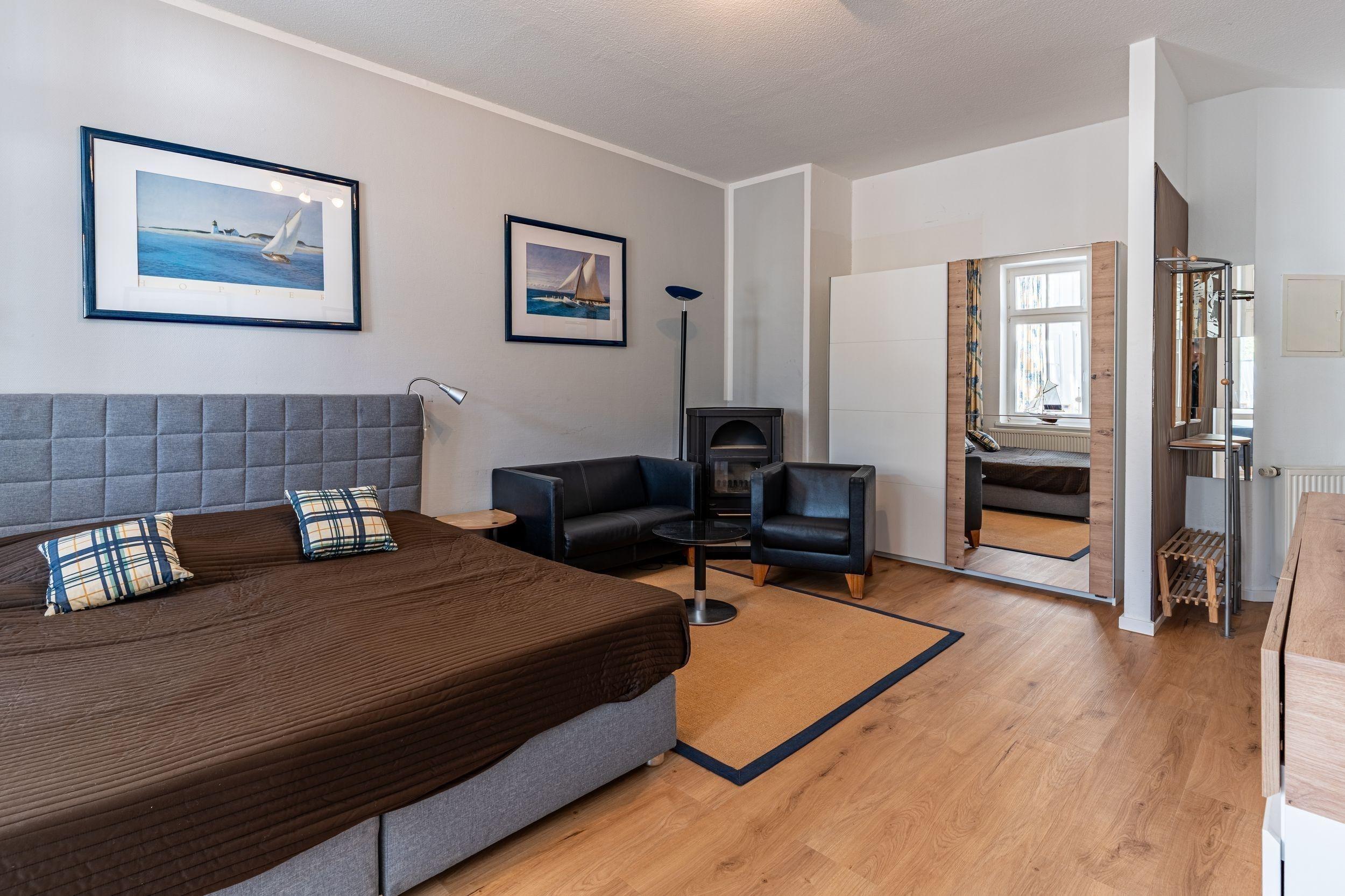 Der großzügige Schlafbereich mit Doppelbett, Flat-TV und gemütlicher Sitzecke am Kamin ist das Herzstück der Wohnung – ideal für ruhige Stunden und gesellige Abende.