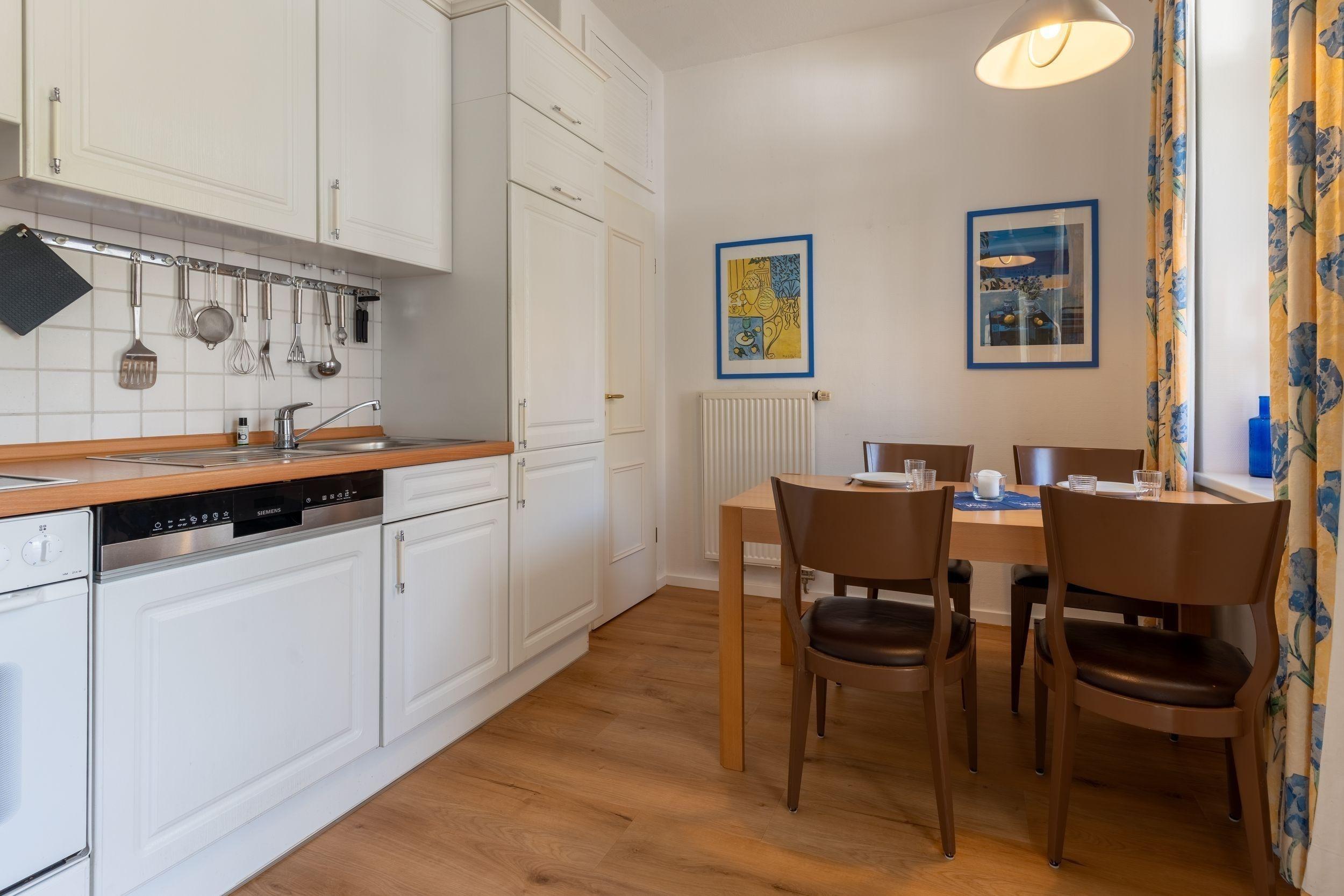 Auf der geschlossenen Veranda befinden sich zwei weitere Schlafplätze in entspannter Atmosphäre. Die separate, voll ausgestattete Küche führt direkt auf den überdachten Balkon – hier starten Sie perfekt in den Tag oder lassen ihn entspannt ausklingen. Ein modernes Wannenbad rundet das Apartment stilvoll ab.
