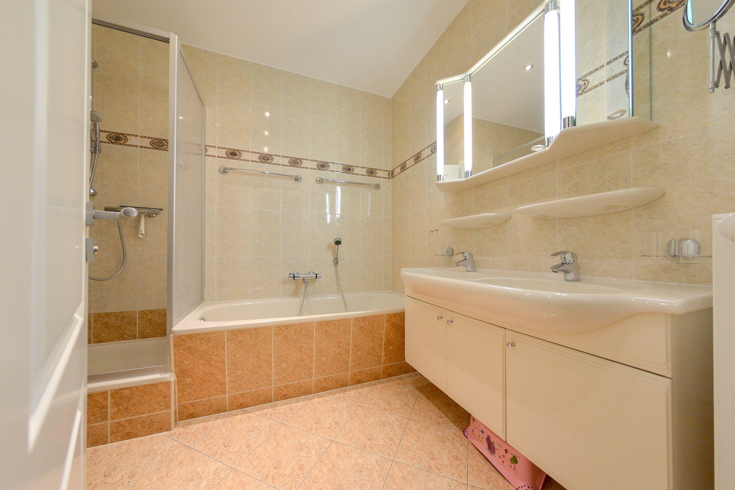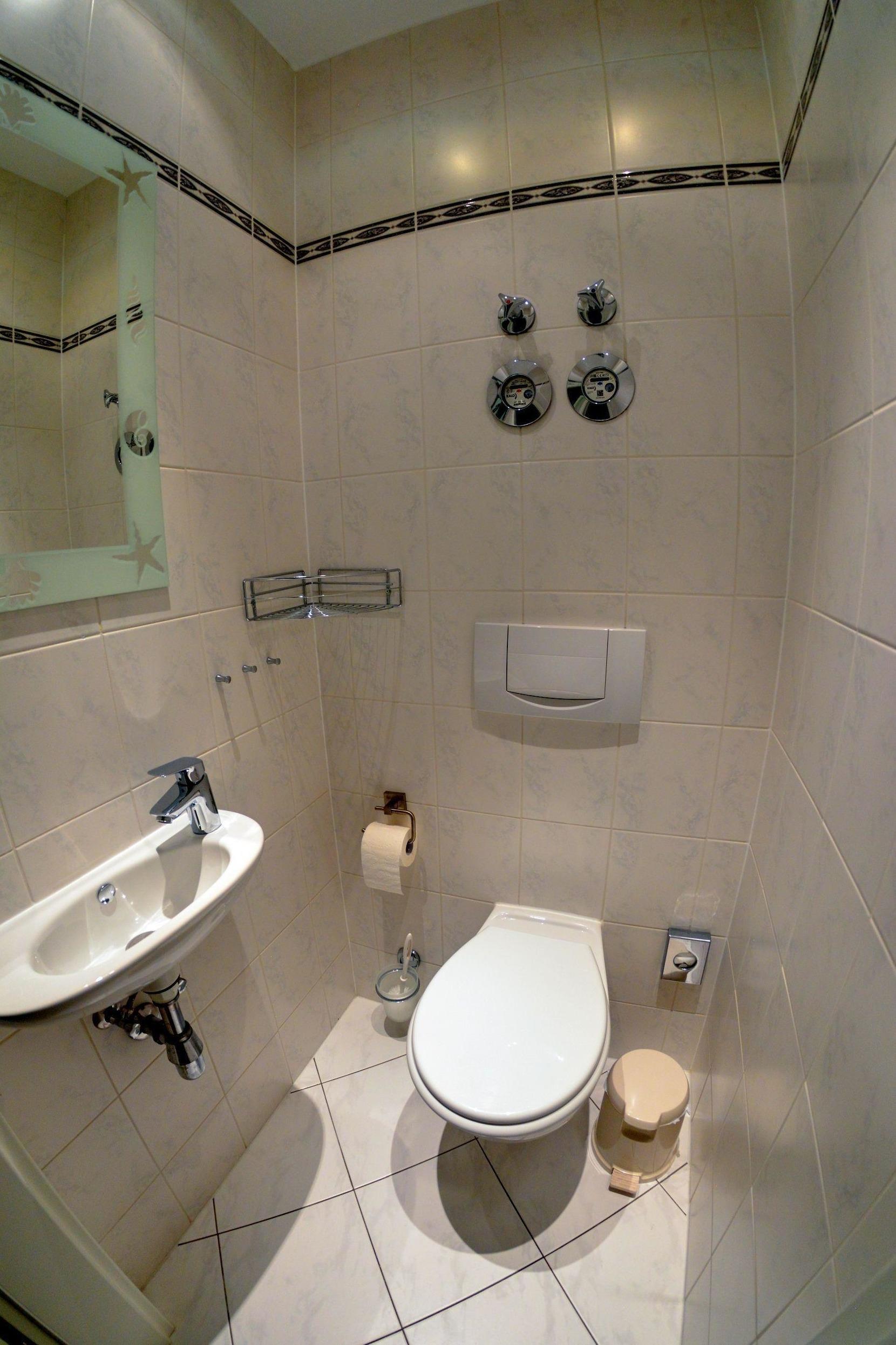 Neben dem Badezimmer mit Dusche, Badewanne, Waschmaschine und Trockner gibt es auch ein Gästebad.
