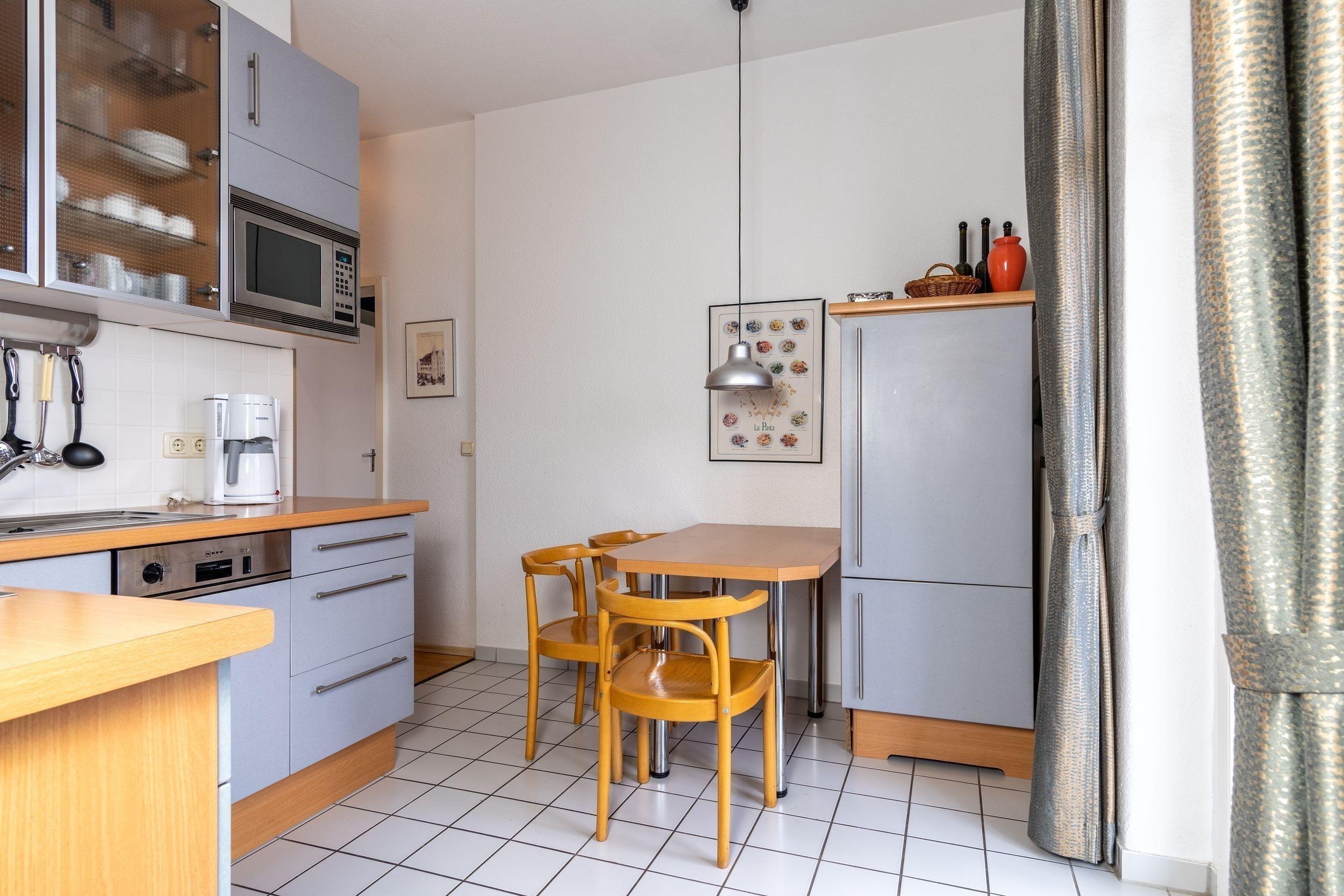 Der gemütliche Wohnbereich ist mit einer bequemen Schlafcouch für 2 Personen (1,40 Breite) und einem TV-Gerät eingerichtet. Die separate Küche ist vollständig ausgestattet, so dass Sie hier problemlos leckere Mahlzeiten zubereiten können, auch ein Esstisch für 4 Personen ist in diesem Raum zu finden.
