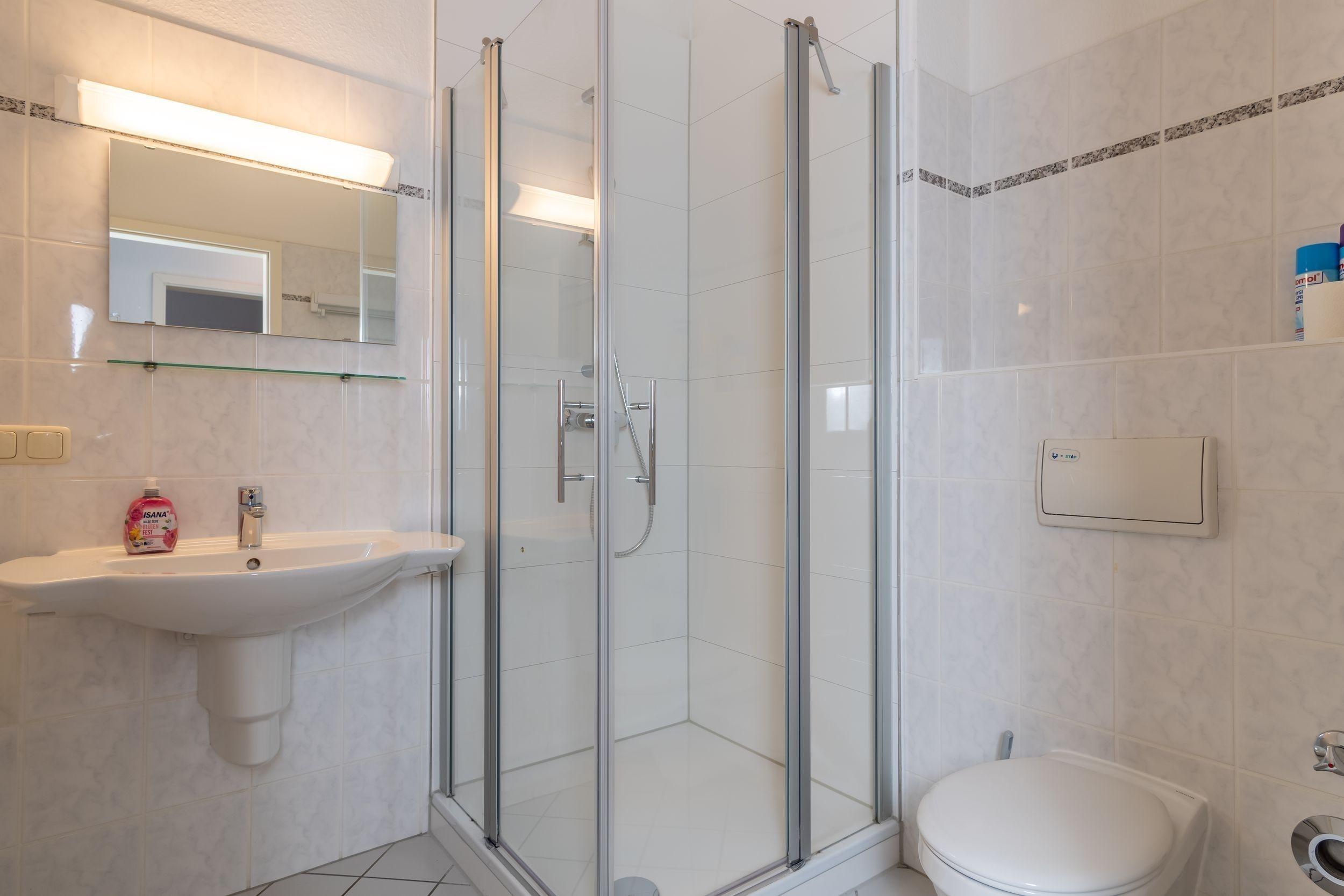Das Badezimmer ist mit einer Eckdusche eingerichtet.