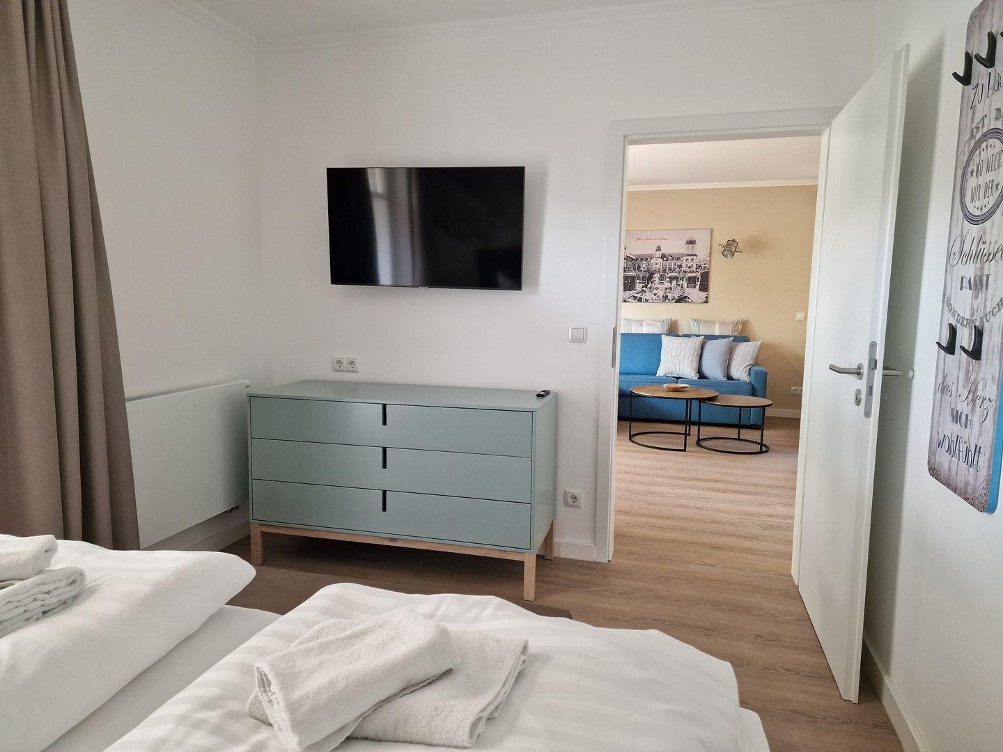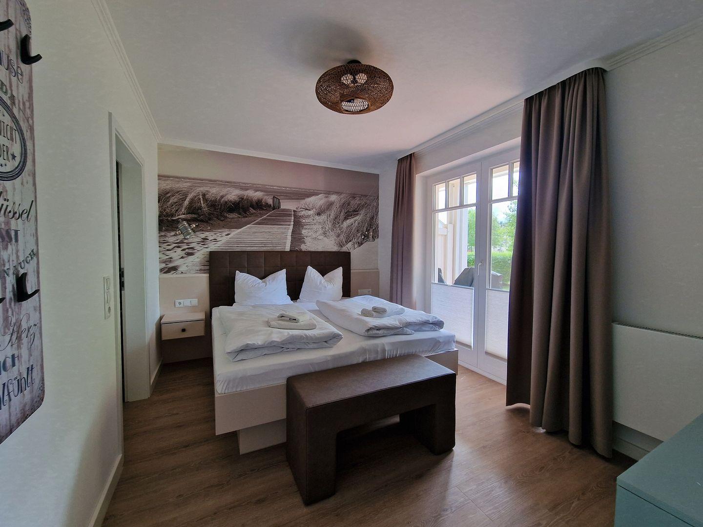 Diese komfortable Ferienwohnung bietet alles was das Herz begehrt und lädt Sie zu einem Frühstück auf Ihrer privaten Terrasse ein. Der Wohnraum verbindet ein gemütliches Wohnzimmer, inklusive eines ausziehbaren Schlafsofas, mit einem Essbereich und einer voll ausgestatteten Küche. Vorhanden sind ein Geschirrspüler, ein Backofen mit Induktionsfeld, eine Mikrowelle sowie ein Wasserkocher, eine Nespresso Kaffeemaschine und ein Toaster. Das Wohnzimmer überzeugt mit einem 55 Zoll LCD-Flachbildschirm, einem DVD-Spieler, einer Stereo-Anlage, einer Hifi Anlage sowie einer Teufel Musikstation. Das Schlafzimmer ist mit einem großen Doppelbett ausgestattet, verfügt über einen 43 Zoll Smart TV und bietet genügend Verstaumöglichkeiten für Ihre Kleidung im Schlafzimmer als auch in der angrenzenden Ankleide. Im Badezimmer erwarten Sie eine geräumige Dusche, ein Waschbecken, ein WC sowie ein großer Ganzkörperspiegel. In der Zeit von Mai bis September ist ein eigener Strandkorb am Strand inklusive
