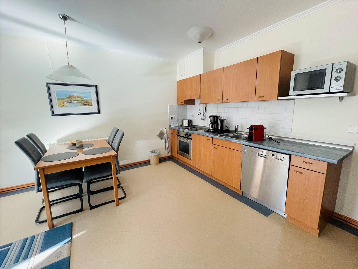 In dieser freundlichen Ferienwohnung genießen Sie Ihr Frühstück auf Ihrem eigenen Süd-West-Balkon. Eine gut ausgestattete Wohnküche verbindet eine Küchenzeile mit einem Essbereich und einem Wohnzimmer. Hier bietet eine Schlafcouch eine zusätzliche Schlafmöglichkeit, zusätzlich stehen hier ein Smart-TV, ein DVD-Player und eine Stereo-Anlage. Die Küchenzeile verfügt über einen Geschirrspüler, eine Back- und Kochmöglichkeit, eine Mikrowelle, einen Wasserkocher, einen Toaster, eine Kaffeemaschine und eine Nespresso- Kaffeemaschine. Das Schlafzimmer liegt separat und ist mit einem Doppelbett sowie Verstaumöglichkeiten ausgestattet. Im Badezimmer erwarten Sie eine geräumige Dusche, ein Waschbecken, ein WC und ein großer Ganzkörperspiegel. Haustiere sind erlaubt.
