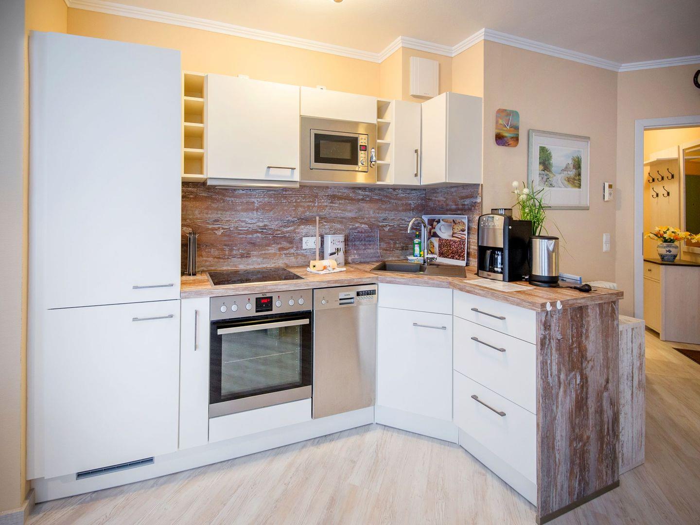 Diese komfortable Ferienwohnung bietet alles was das Herz begehrt und lädt Sie zu einem Frühstück auf Ihrer privaten Terrasse ein. Der Wohnraum verbindet ein gemütliches Wohnzimmer, inklusive eines ausziehbaren Schlafsofas, mit einem Essbereich und einer voll ausgestatteten Küche. Vorhanden sind ein Geschirrspüler, ein Backofen mit Kochfeld, eine Mikrowelle sowie ein Wasserkocher, eine Kaffeemaschine und ein Toaster. Das Wohnzimmer überzeugt mit einem 49 Zoll LCD-Flachbildschirm, einem DVD-Spieler und einer Stereo-Anlage mit DAB und Bluetooth. Das Schlafzimmer bietet eine Doppelbett sowie ausreichend Verstaumöglichkeiten für Ihre Kleidung. Im Badezimmer erwarten Sie eine geräumige Dusche, ein Waschbecken, ein WC sowie ein großer Ganzkörperspiegel. Inklusive sind 3 Fahrräder zur kostenfreien Nutzung. Zusätzlich sind alle Fenster mit Insektenschutz ausgestattet.