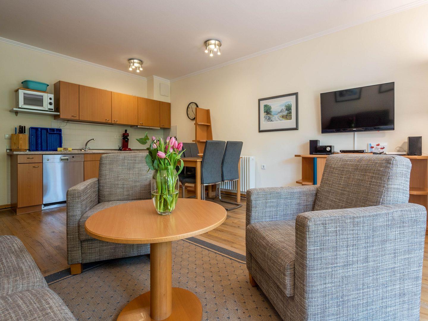 Wohnraum, separates Schlafzimmer, Terrasse, eingerichtete Küchenzeile mit Geschirrspüler und Mikrowelle, Dusche/ WC, LCD-TV, DVD-Spieler, Stereoanlage, Haustiere nicht erlaubt, Nichtraucher