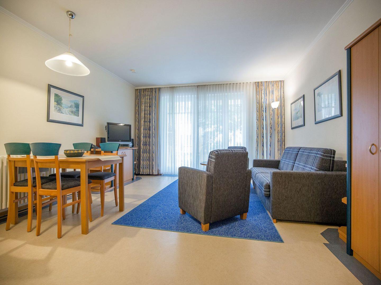 Wohnraum, separates Schlafzimmer, Terrasse, eingerichtete Küchenzeile mit Geschirrspüler und Mikrowelle, Bad mit Dusche/ WC, LCD-Flachbildschirm, DVD-Spieler, Stereo-Anlage, Nichtraucher, Haustiere nicht erlaubt. In der Zeit von Mai bis September ist ein eigener Strandkorb am Strand inklusive.