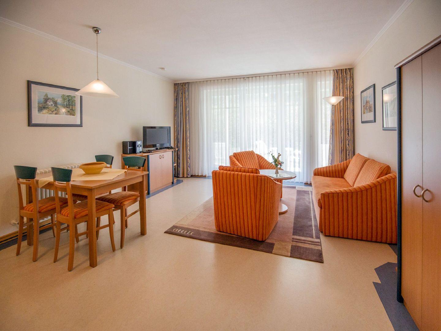 Wohnraum, separates Schlafzimmer, Terrasse, eingerichtete Küchenzeile mit Geschirrspüler und Mikrowelle, Bad mit Dusche/ WC, LCD-Flachbildschirm, DVD-Player, Stereo-Anlage, Nichtraucher, Haustiere nicht erlaubt