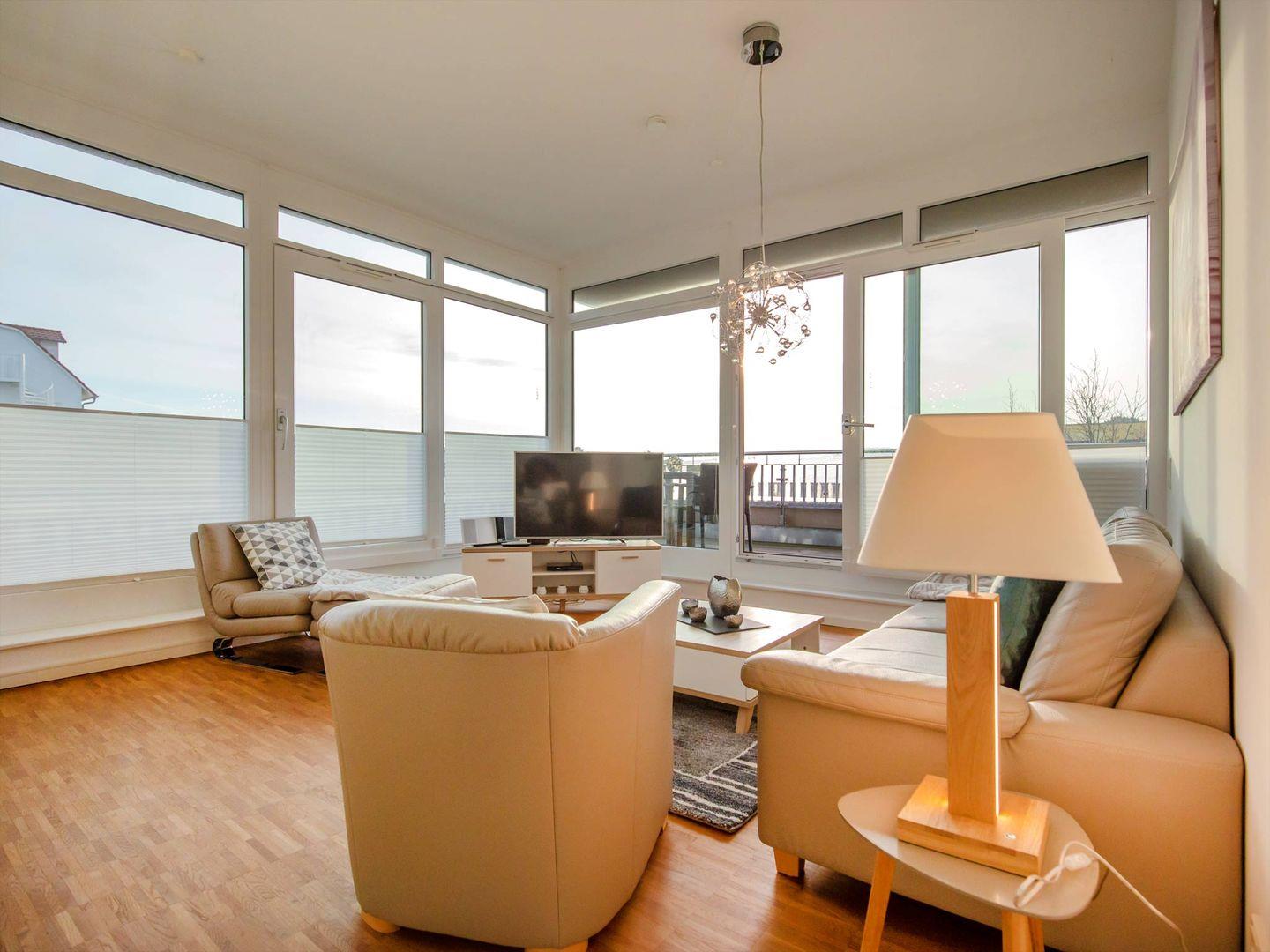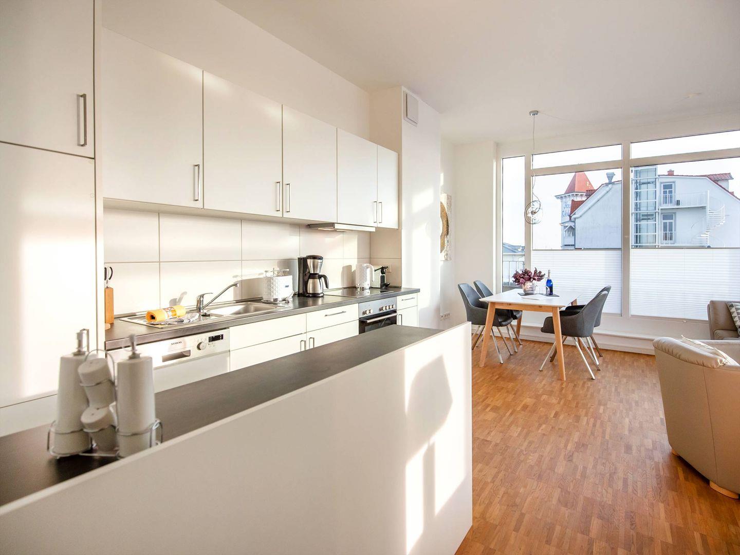DünenResort Binz; Penthouse Ferienwohnung mit lichtdurchflutetem Wohnzimmer, rundum Balkon und eigener Dachterrasse, teilweise Meerblick, LCD-Flachbildfernseher, DVD-Player, Stereo-Anlage, eingerichtete Küchenzeile mit Geschirrspüler, Backofen und Cerankochfeld, NESPRESSO Kaffeemaschine, 2 Schlafzimmer mit Doppelbett und LCD-Fernseher, Bad mit Whirlpool-Badewanne und Dusche/WC und eigener Waschmaschine, zusätzliches Gäste-WC, Safe, Haustiere nicht erlaubt, Nichtraucher, Fußbodenheizung in der gesamten Wohnung, eigene Sauna, inkl. Tiefgaragenstellplatz (Höhe: 2,00m), kostenfreier W-LAN-Anschluss max. Belegung 4 Erwachsene