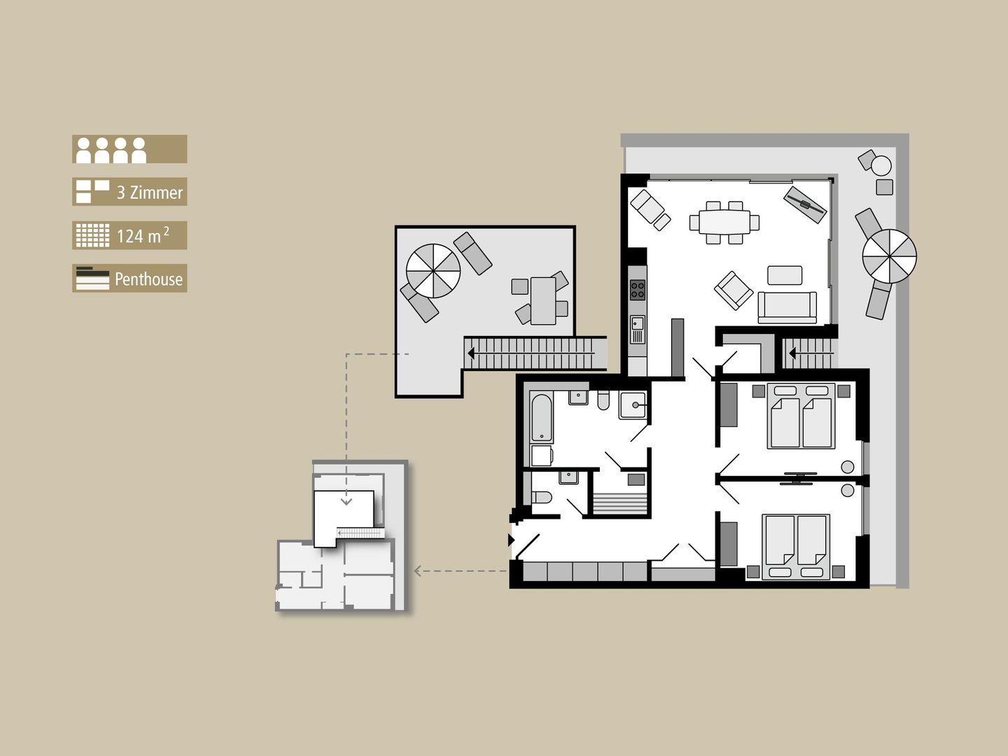 Diese komfortable Ferienwohnung bietet alles was das Herz begehrt und lädt Sie zu einem Frühstück entweder auf dem rundum Balkon oder der privaten Dachterrasse ein. Der großzügige Wohnraum verbindet das Wohnzimmer mit LCD-Flachbildfernseher, DVD-Player und Stereo-Anlage mit dem Essbereich und einer voll ausgestatteten Küche. Hier finden sich ein Geschirrspüler, ein Backofen mit Cerankochfeld, eine Mikrowelle, ein Toaster, ein Wasserkocher und eine NESPRESSO Kaffeemaschine. Beide Schlafzimmer verfügen über gemütliche Doppelbetten und einen LCD-Fernseher. Im Badezimmer erwartet Sie neben einer geräumigen Dusche eine Whirlpool-Badewanne, ein Waschbecken, ein WC sowie ein großer Spiegel. Zusätzlich gibt es eine Sauna, ein Gäste-WC und eine eigene Waschmaschine. Die ganze Wohnung hat Fußbodenheizung und ein Tiefgaragenstellplatz ist inklusive.
