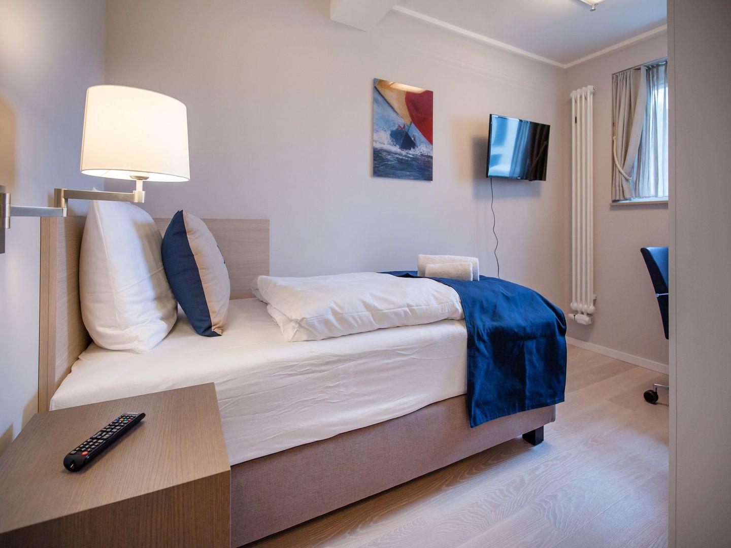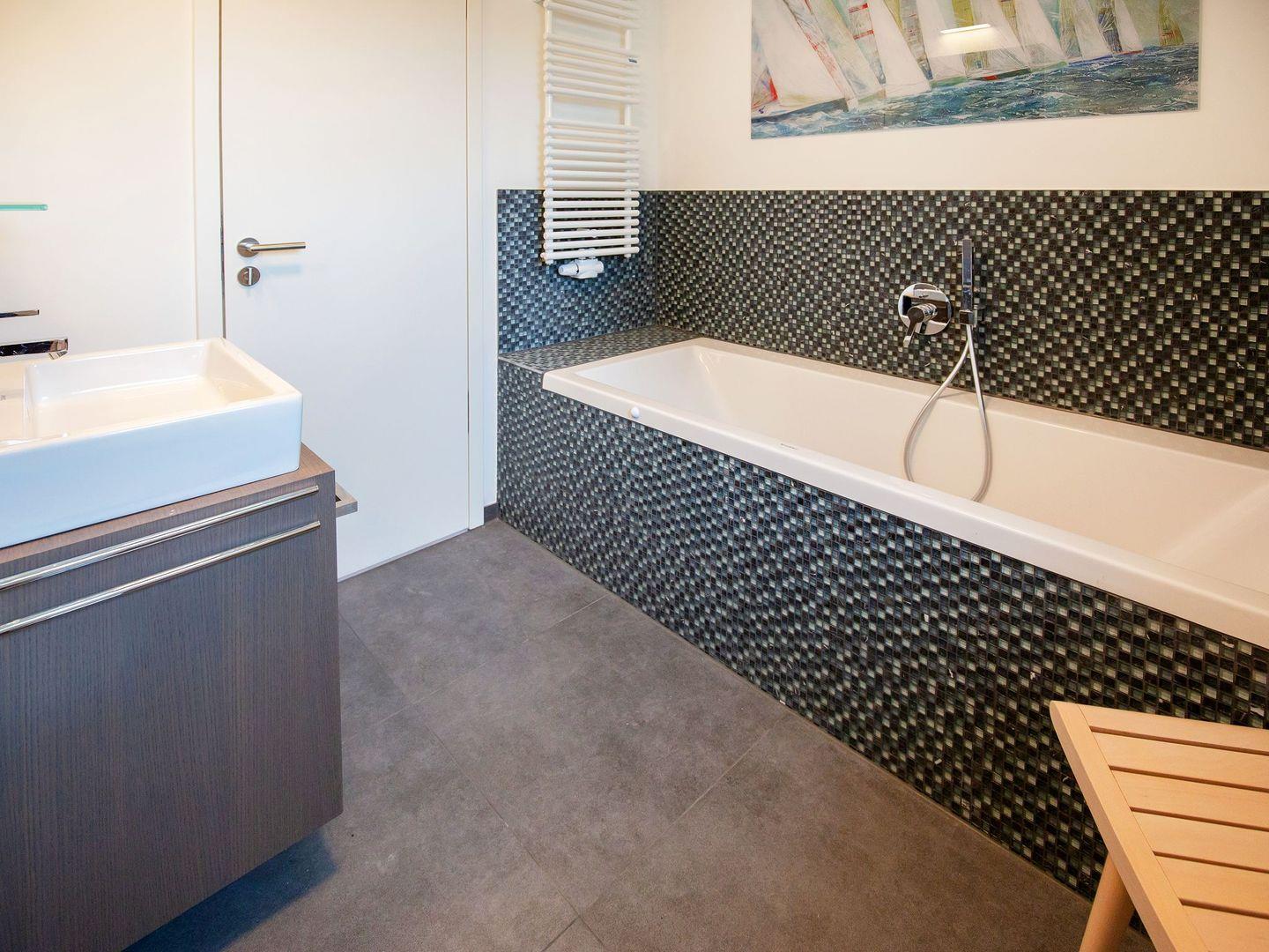 Diese hochwertig eingerichtete Ferienwohnung mit privatem Balkon mit Seeblick besteht aus einem großen Wohnraum mit Küche und Essbereich sowie drei separaten Schlafzimmern. Die Küchenzeile ist eingerichtet und überzeugt mit einem Kochfeld, einem Backofen, einem Geschirrspüler, einem Wasserkocher, einer Kaffeemaschine und einem Toaster. Im Wohnzimmer, wie auch in einem der drei Schlafzimmer stehen LCD-TV. Alle Schlafzimmer liegen separat und sind zweimal mit einem Doppelbett und einmal mit einem Einzelbett ausgestattet. Eines der Badezimmer überzeugt mit einer geräumigen Dusche, das andere mit einer Badewanne. Das gewisse Extra bietet die private Sauna. Haustiere sind in dieser Wohnung herzlich willkommen.