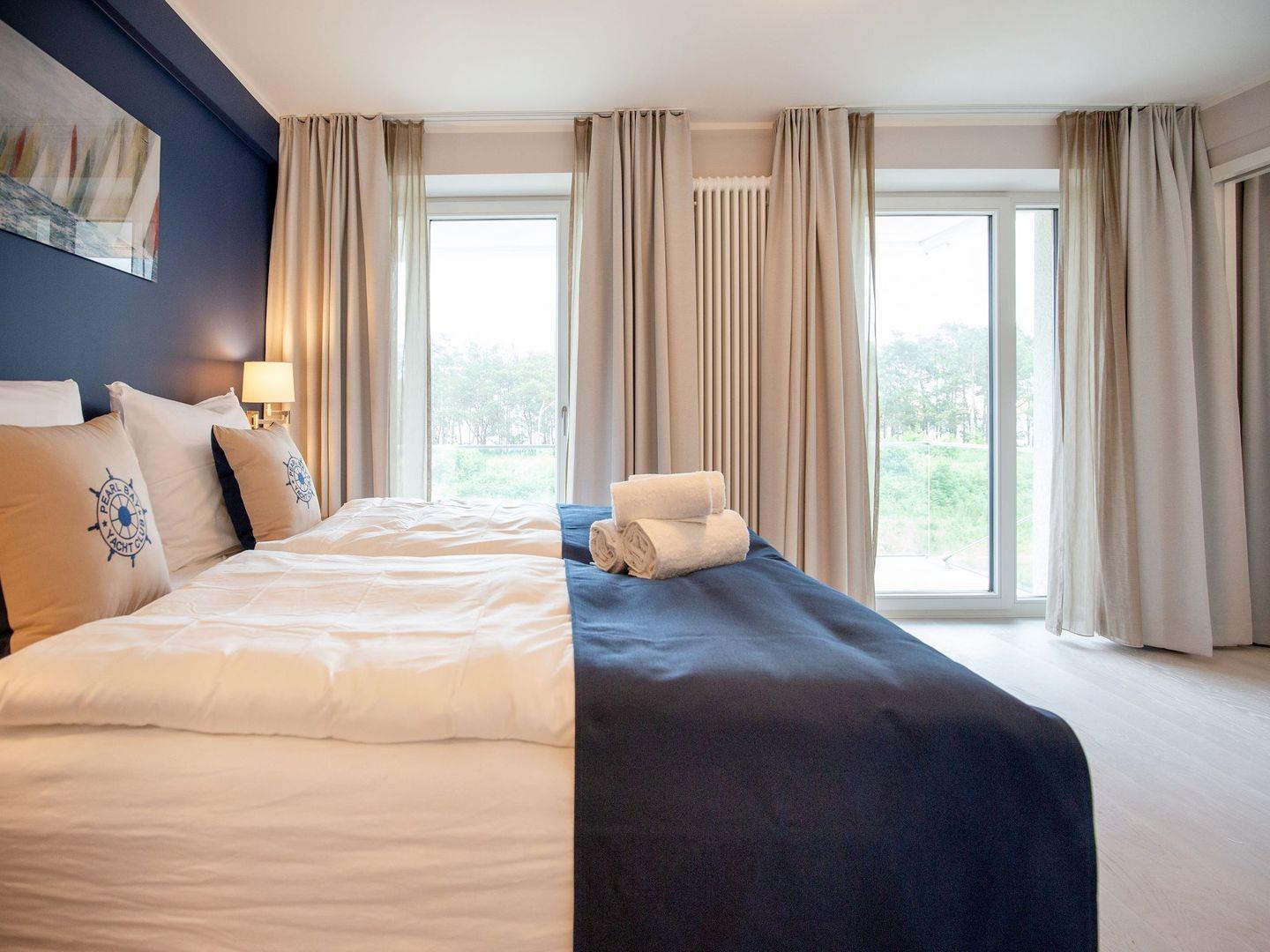 Dünenresidenz Neues Prora, Wohnzimmer mit LCD-TV, Balkon mit Meerblick, eingerichtete Küchenzeile mit Geschirrspüler und Backofen, 2 Schlafzimmer mit Doppelbett und davon eines mit Fernseher, ein Schlafzimmer mit Einzelbett, ein Bad mit Dusche, eigene Sauna, ein Bad mit Badewanne, kostenfreier WLAN-Anschluss (64 Mbit/s), Haustiere erlaubt, Nichtraucher, max. Belegung 5 Personen