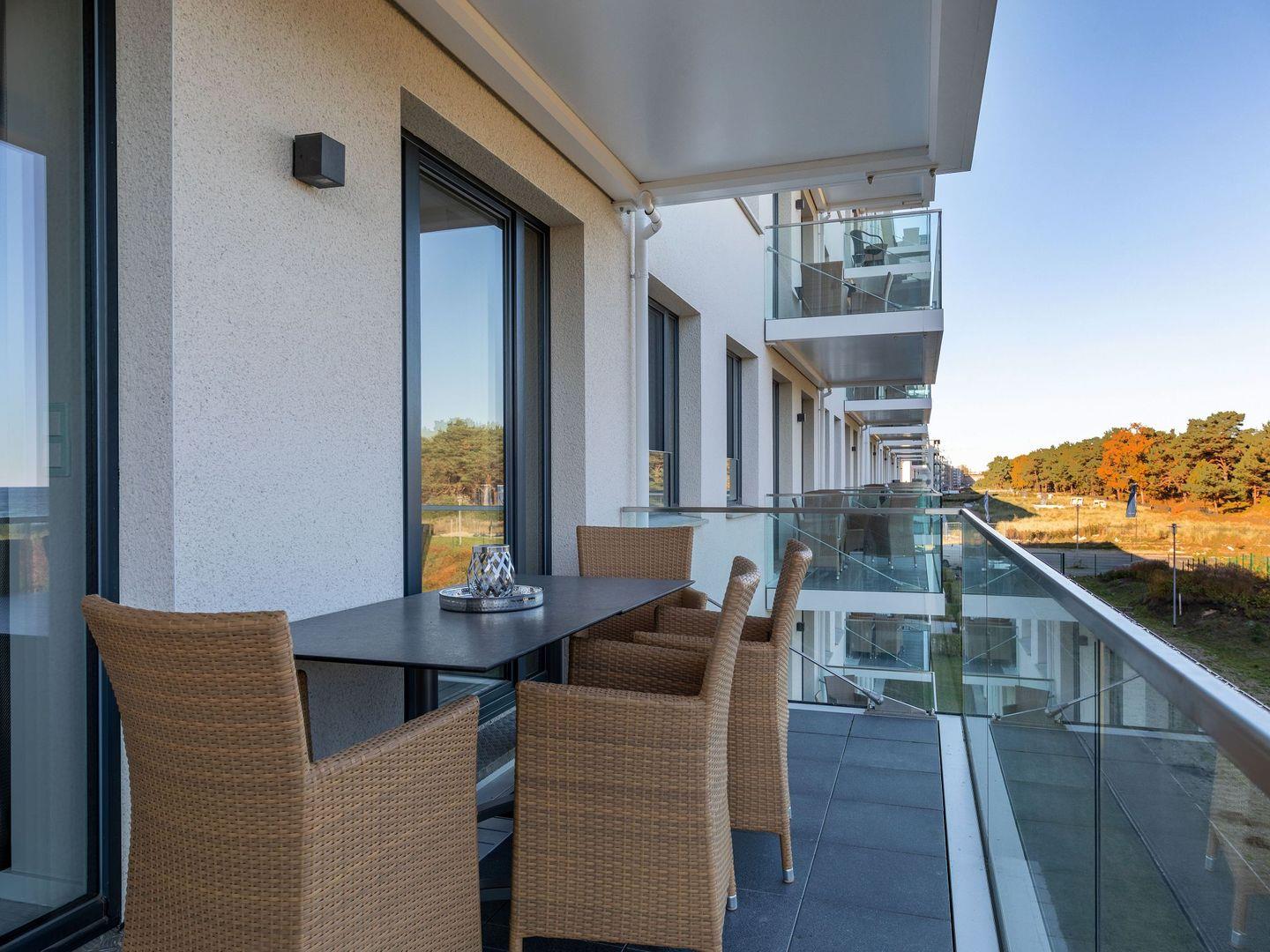 Diese hochwertig eingerichtete Ferienwohnung mit privatem Balkon mit Seeblick besteht aus einem großen Wohnraum mit Küche und Essbereich sowie drei separat liegenden Schlafzimmern. Die Küche ist eingerichtet und überzeugt mit einem Kochfeld, einem Backofen, einem Geschirrspüler, einem Wasserkocher, einer Kaffeemaschine und einem Toaster. Im Wohnzimmer, wie auch in den beiden Schlafzimmern mit Doppelbett stehen LCD-TV, zusätzlich gibt es hier eine Soundbar. Das separate Bürozimmer bietet eine weitere Schlafmöglichkeit für eine Person. Eines der Badezimmer überzeugt mit einer geräumigen Dusche, das andere mit einer Badewanne. Das gewisse Extra bietet die private Sauna.