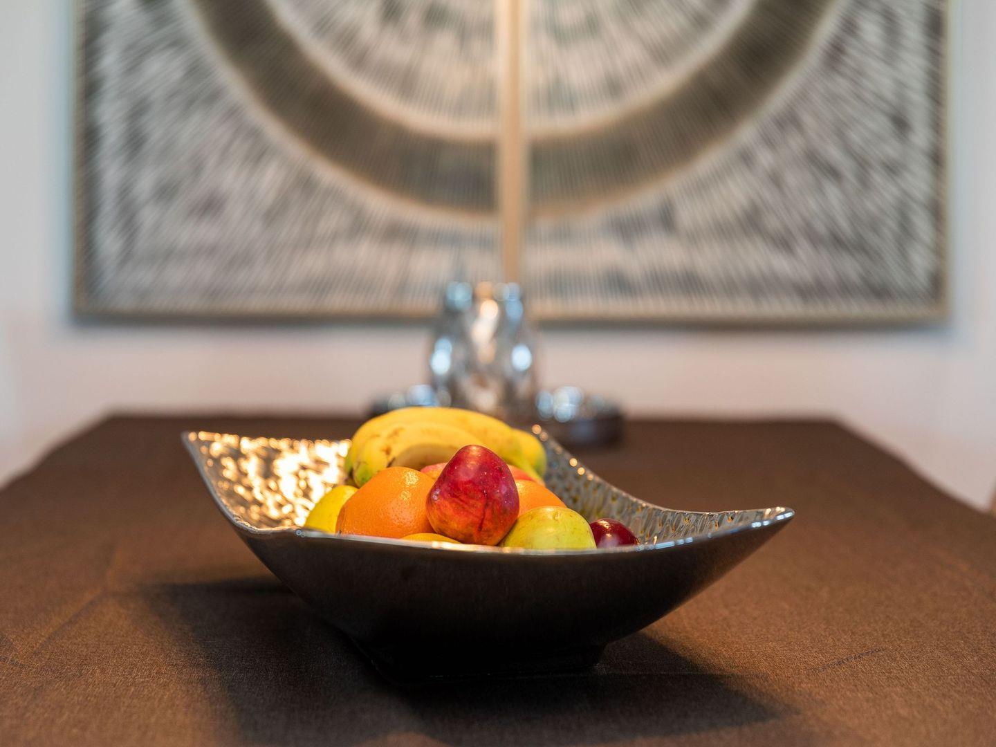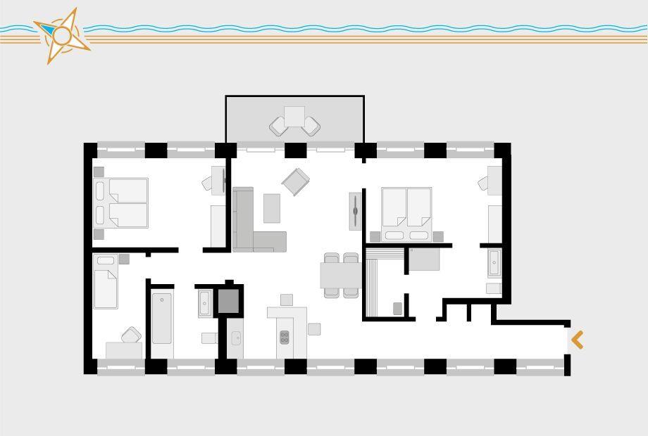 Wohnzimmer mit LCD-TV & Soundbar, Balkon mit Meerblick, eingerichtete Küchenzeile, Geschirrspüler, Backofen, 2 Schlafzimmer mit Doppelbett und Fernseher, separates Bürozimmer, zwei Bäder, Dusche und Badewanne, Sauna, WLAN, Haustiere nicht erlaubt, Nichtraucher, Allergiker geeignet, max.5 Pers.