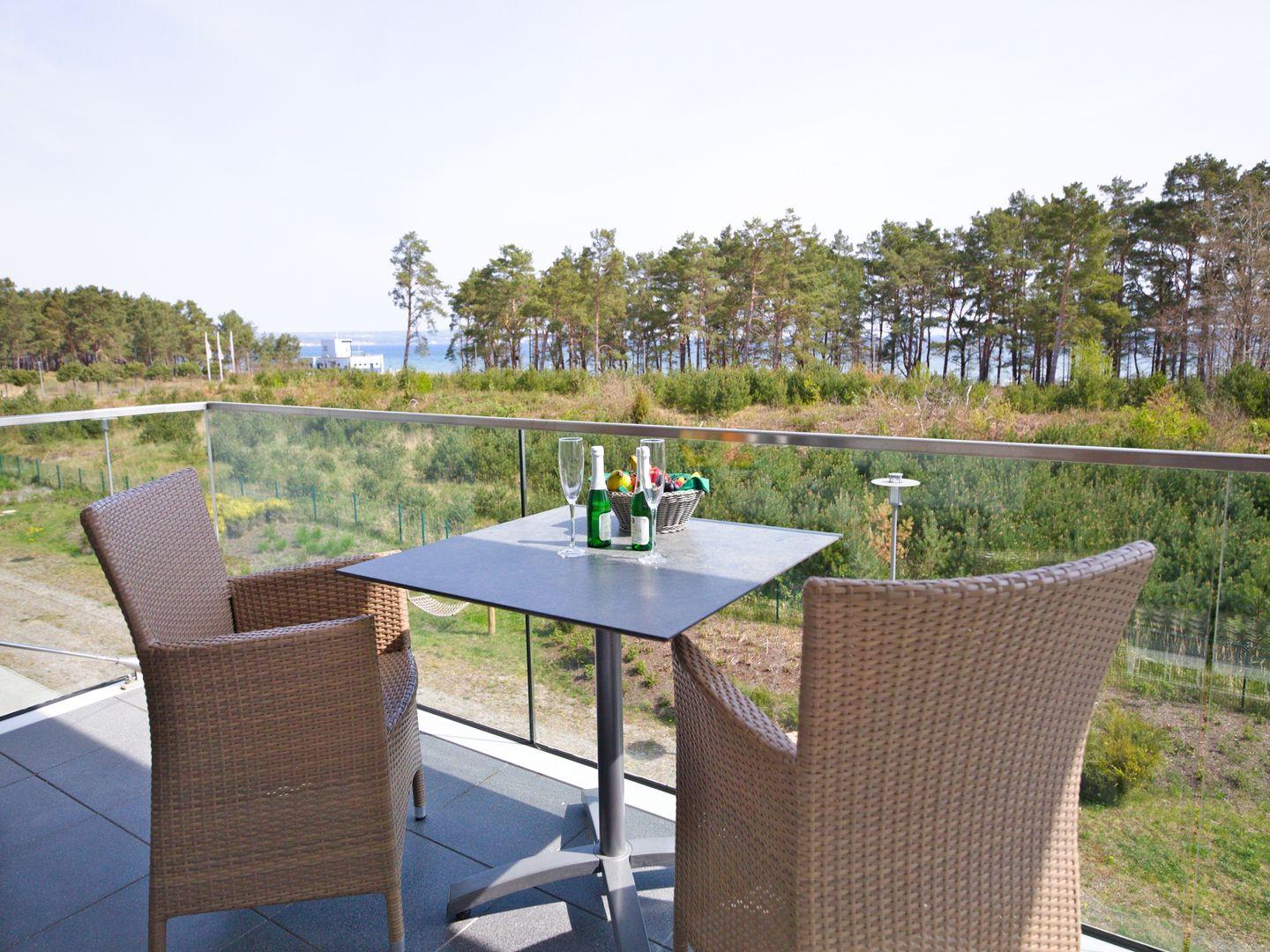 Dünenresidenz Neues Prora, Wohnzimmer mit LCD-TV, Balkon mit Meerblick, eingerichtete Küchenzeile mit Geschirrspüler und Backofen, Schlafzimmer mit Doppelbett und Fernseher, Bad mit Dusche, eigene Sauna, kostenfreier WLAN-Anschluss, Haustiere nicht erlaubt, Nichtraucher, eigener Strandkorb (Mai - September) gegen Aufpreis buchbar