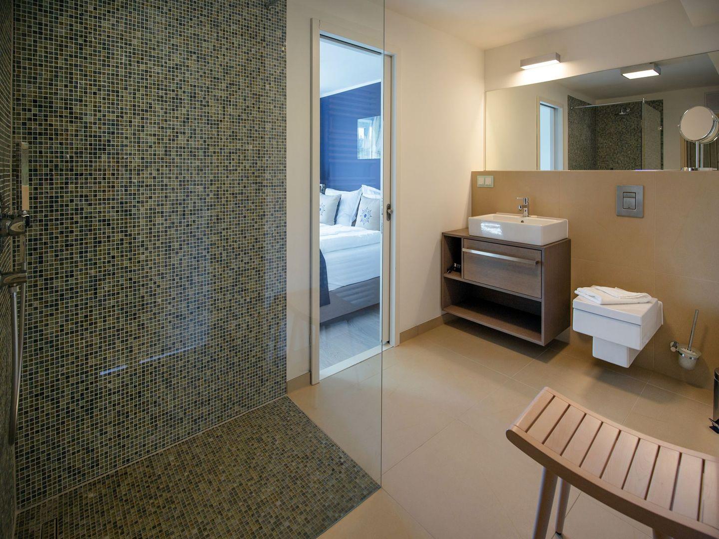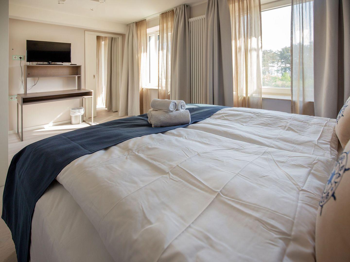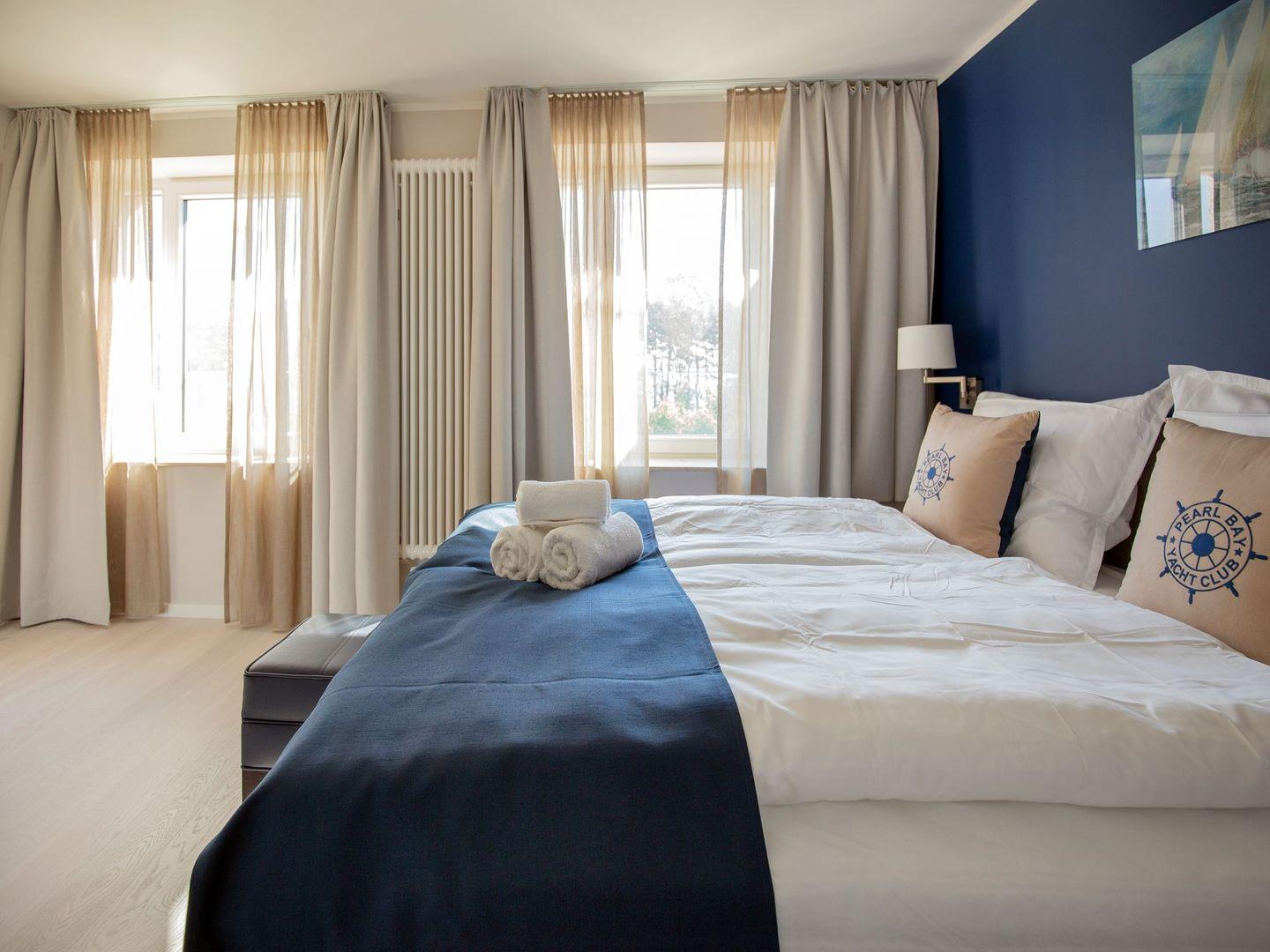 Diese hochwertig eingerichtete Ferienwohnung mit privatem Balkon mit Seeblick besteht aus einem großen Wohnraum mit Küche und Essbereich sowie einem separaten Schlafzimmer. Die Küchenzeile ist eingerichtet und überzeugt mit einem Kochfeld, einem Backofen, einem Geschirrspüler, einem Wasserkocher, einer Kaffeemaschine und einem Toaster. Im Wohnzimmer, wie auch im Schlafzimmer stehen LCD-TV. Das Schlafzimmer ist mit einem gemütlichen Doppelbett ausgestattet. Das Badezimmer überzeugt mit einer geräumigen Dusche, einem Waschbecken, einem WC und einem großen Spiegel. Das gewisse Extra bietet die private Sauna. In der Zeit von Mai bis September ist ein eigener Strandkorb am Strand gegen Aufpreis buchbar.