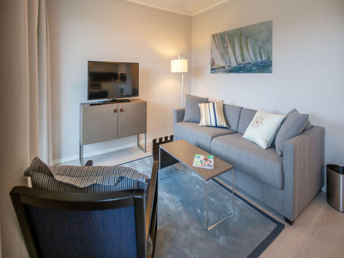 Dünenresidenz Neues Prora, Wohnzimmer mit LCD-TV, Balkon mit Meerblick, eingerichtete Küchenzeile mit Geschirrspüler und Backofen, Schlafzimmer mit Doppelbett und Fernseher, ein Bad mit Dusche, kostenfreier WLAN-Anschluss, Haustiere nicht erlaubt, Nichtraucher, max. Belegung 2 Personen