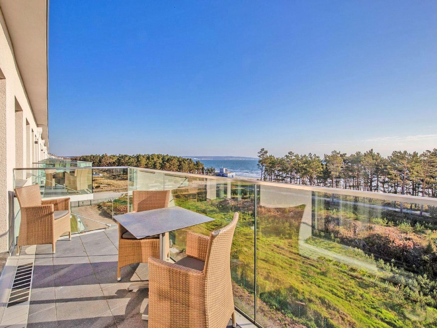 Dünenresidenz Neues Prora, Wohnzimmer mit LCD-TV, Balkon mit Meerblick, Dachterrasse mit Rundumsicht, eingerichtete Küchenzeile mit Geschirrspüler und Backofen, Schlafzimmer mit Doppelbett und Fernseher, Bad mit Dusche, kostenfreier WLAN-Anschluss, Haustiere erlaubt, Nichtraucher
